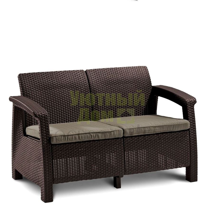 2-х местный диван: W128 х D70 х H79 см. Материал: пластик, имитация ротанга Цвет: Brown Подушки cappuccino в комплекте. 1 коробка: 70х67х60. Вес - 16 кг