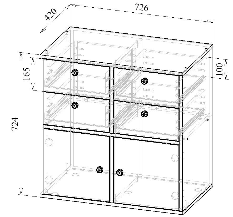 При необходимости дополняется ящиками со стеклянными фасадами или большими ящиками системы Прайм. В выдвижных ящиках наполнения используются качественные роликовые направляющие.