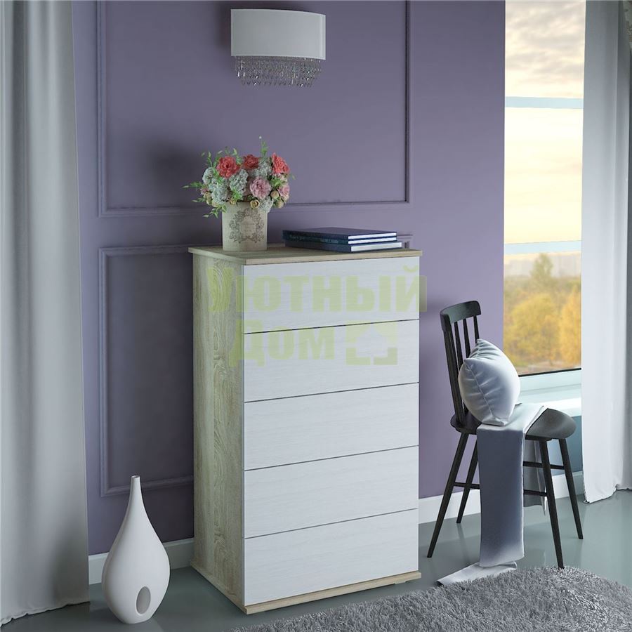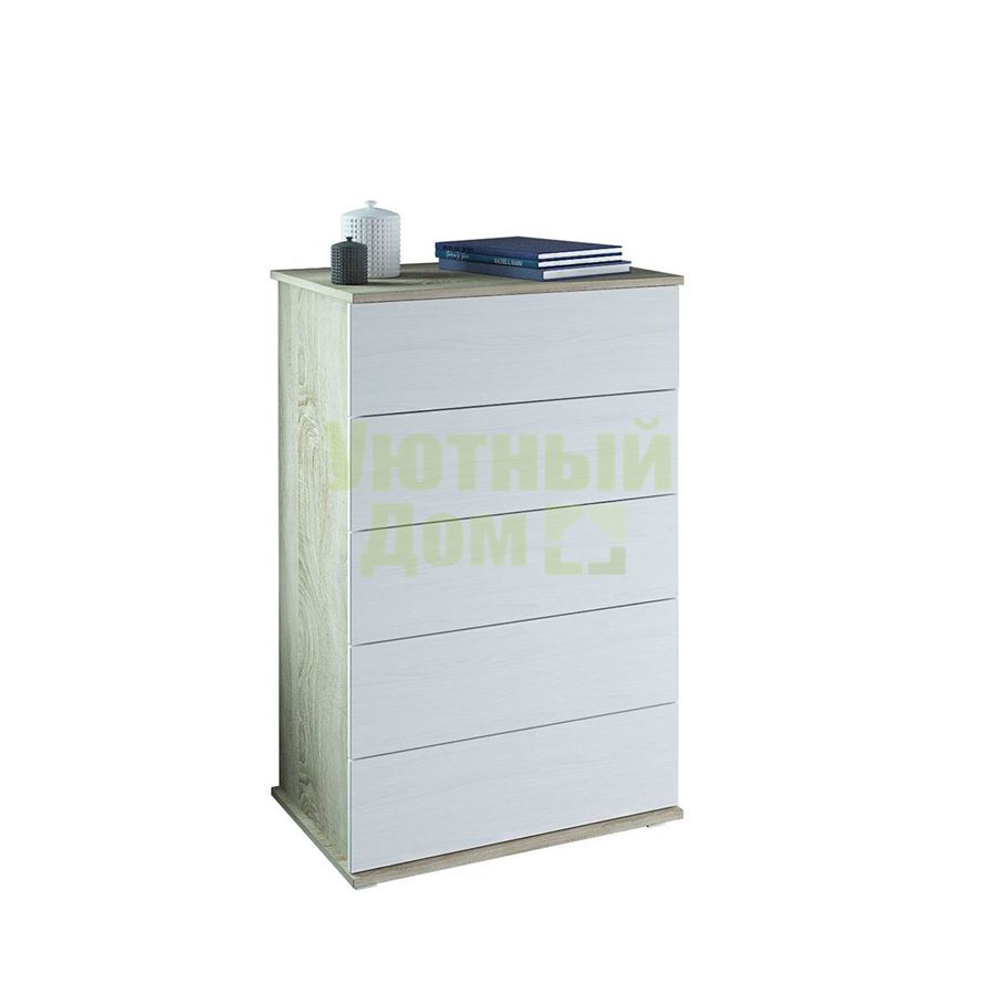 Стиль: Современный; Цвет изделия: дуб сонома / белый; Ширина: 60; Глубина: 44,6; Высота: 105,9; Материал каркаса: ЛДСП; Материал фасадов: ЛДСП; Количество ящиков: 5; Наличие дверей: Нет; Форма поставки: В разобранном виде; Гарантия производителя : 12 месяцев; Производитель: Россия