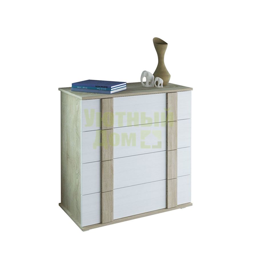 Стиль: Современный; Цвет изделия: дуб сонома / белый; Ширина: 80; Глубина: 44,6; Высота: 86; Материал каркаса: ЛДСП; Материал фасадов: ЛДСП; Количество ящиков: 4; Наличие дверей: Нет; Форма поставки: В разобранном виде; Гарантия производителя : 12 месяцев; Производитель: Россия