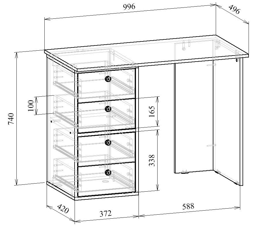 Стол является комплектом модульной системы Прайм. Вы можете собрать индивидуальный комплект из столешниц разных размеров, тумб разных форм и их наполнений (дверок, блока ящиков, ящиков со стеклом или больших ящиков).
