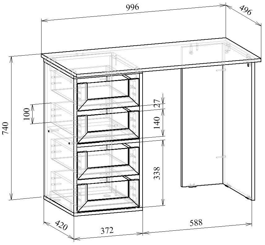 Стол является комплектом модульной системы Прайм. Вы можете собрать индивидуальный комплект из столешниц разных размеров, тумб разных форм и их наполнений (дверок, блока ящиков, ящиков со стеклом или больших ящиков).