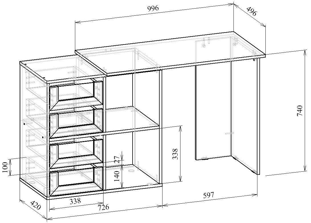 Комплект состоит из: столешницы Прайм-10 (1 шт.), тумбы Прайм-22 (1 шт.), блока ящиков со стеклом Прайм (2 шт.)