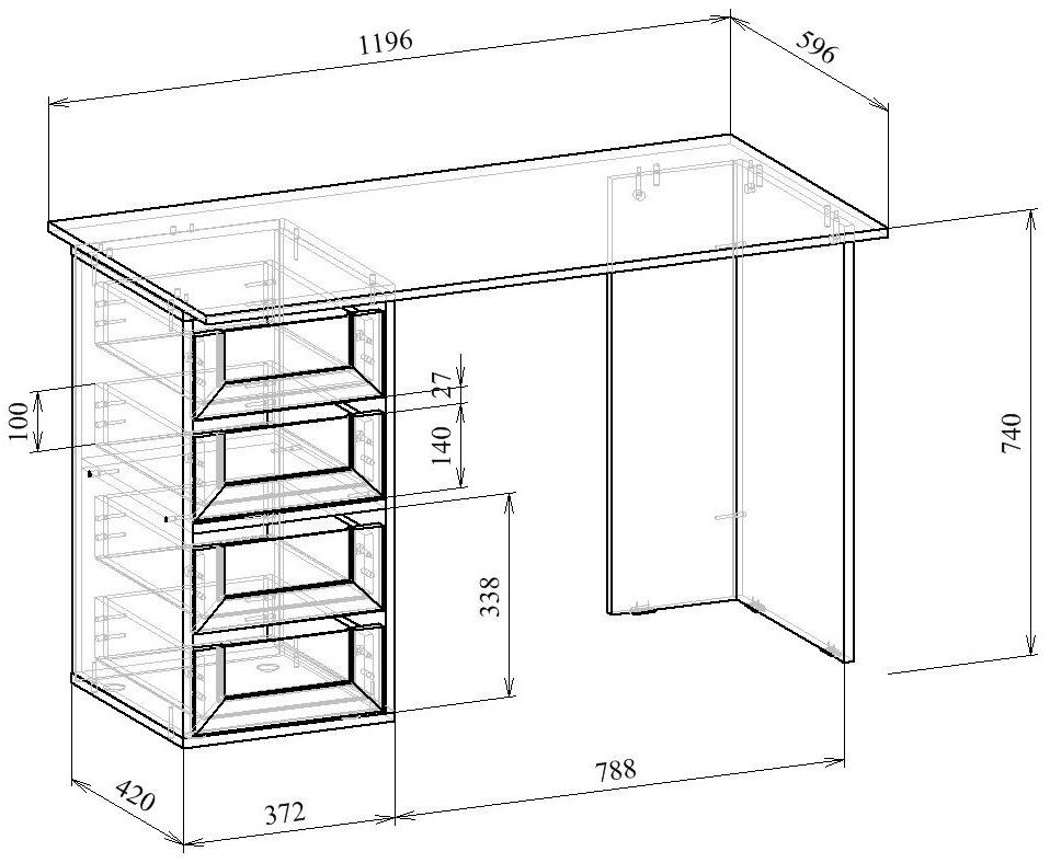 Стол является комплектом модульной системы Прайм. Вы можете собрать индивидуальный комплект из столешниц разных размеров, тумб разных форм и их наполнений (дверок, блока ящиков, ящиков со стеклом или больших ящиков).
