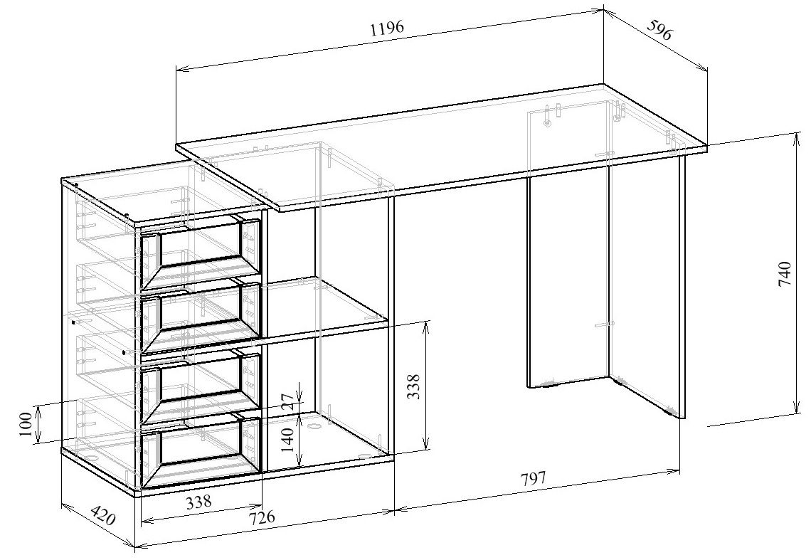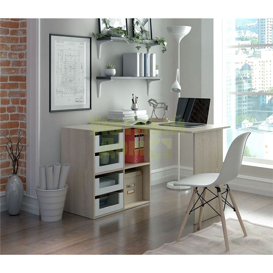 Стол является комплектом модульной системы Прайм. Вы можете собрать индивидуальный комплект из столешниц разных размеров, тумб разных форм и их наполнений (дверок, блока ящиков, ящиков со стеклом или больших ящиков).