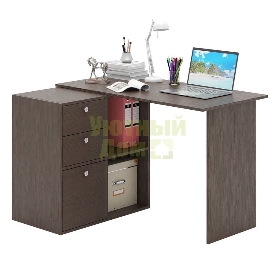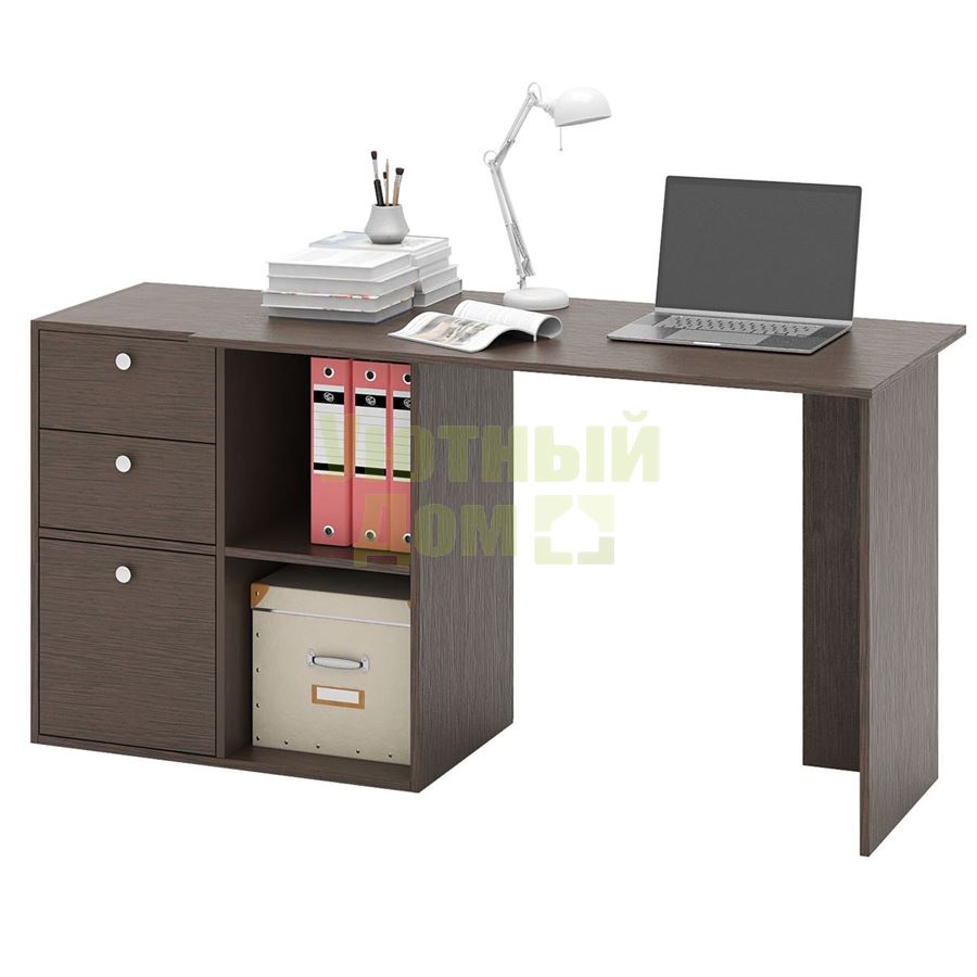 Стол является комплектом модульной системы Прайм. Вы можете собрать индивидуальный комплект из столешниц разных размеров, тумб разных форм и их наполнений (дверок, блока ящиков, ящиков со стеклом или больших ящиков). Тип ручки: кнопка. Декоративные заглушки в тон мебели. Войлочные и пластиковые подпятники. В выдвижных ящиках используются качественные роликовые направляющие. Сборку данного товара желательно осуществлять вдвоем во избежание травмоопасных ситуаций или механических повреждений мебели. Комплект состоит из: столешницы Прайм-12 (1 шт.), тумбы Прайм-22 (1 шт.), блока ящиков Прайм (1 шт.), большого ящика Прайм (1 шт.) Стол можно собрать как в правом, так и в левом исполнении. Благодаря универсальности конструкции, вы можете установить как прямой, так и угловой вариант стола.