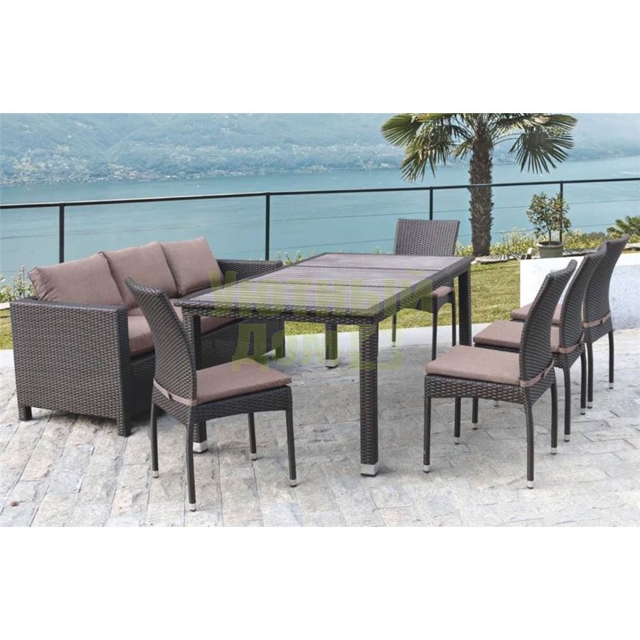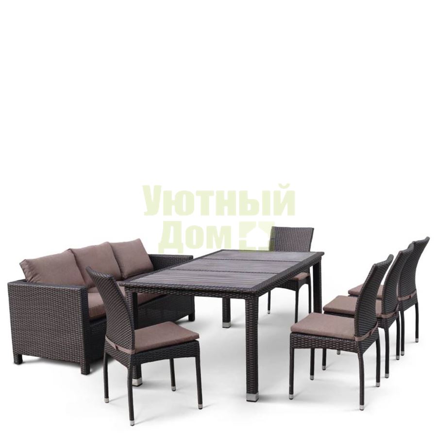 Комплект плетеной мебели T347/S65A/Y380A-W53 Brown (8+1) от бренда Afina. В составе комплекта: стол - столешница декинг, трех местный диван и 5 стульев. Высококачественная лоза из полиротанга коричневого цвета стойкая к любым атмосферным явлениям. Крепкий стальной каркас с полимерным антивандальным покрытием и отличным качеством сварки. Изделие сплетено вручную нашими мастерами под жестким контролем качества на каждом этапе производства. Лоза максимально приближена по рельефу и текстуре к естественному материалу. Идеально подходит для использования на улице и внутри помещения в любую погоду. Не боится воды, солнца и минусовой температуры.