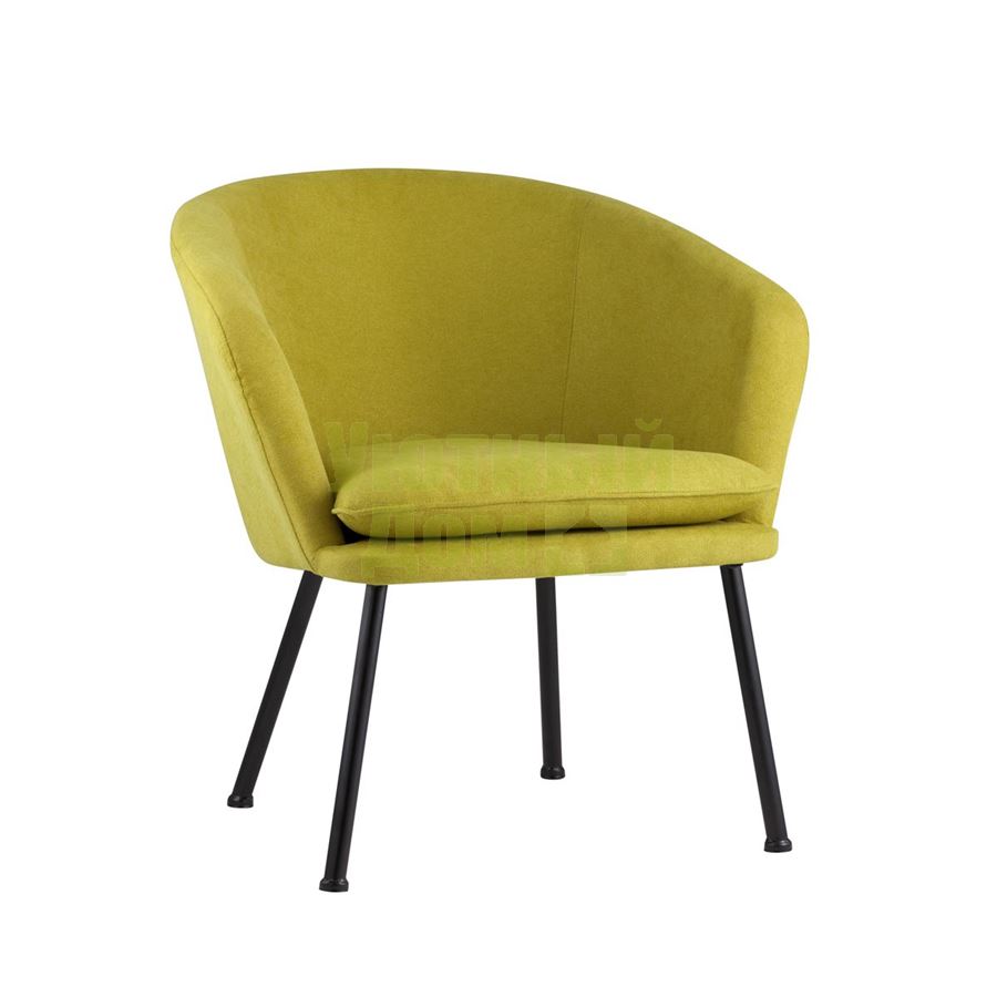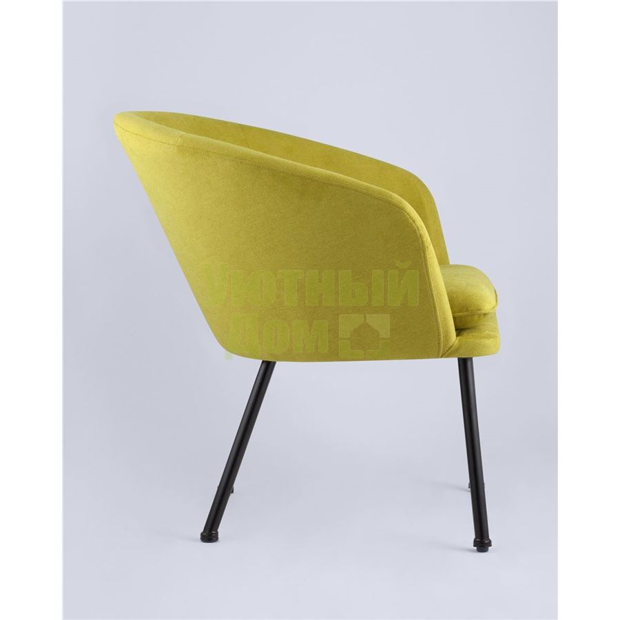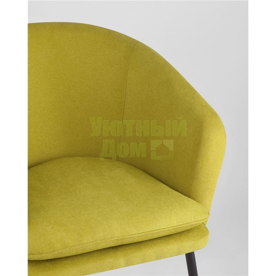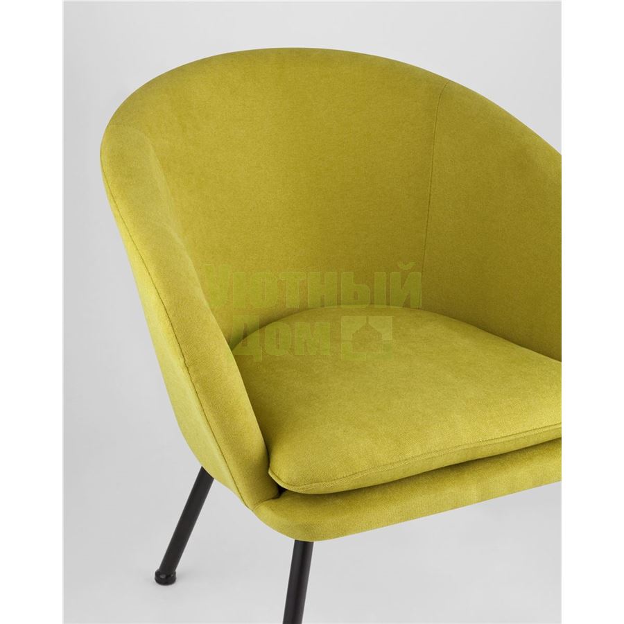 Широкая спинка плавно переходит в удобные подлокотники. Для дополнительного комфорта в кресле есть мягкое плотное сиденье. В качестве обивки используется ткань шенилл, плотный износостойкий материал с бархатистой структурой, приятный на ощупь. Металлический каркас добавляет устойчивости и выдерживает нагрузку до 120 кг. Ножки металлические черные.
