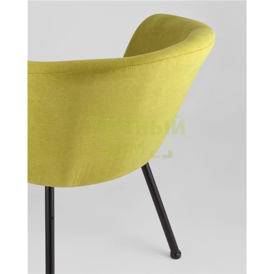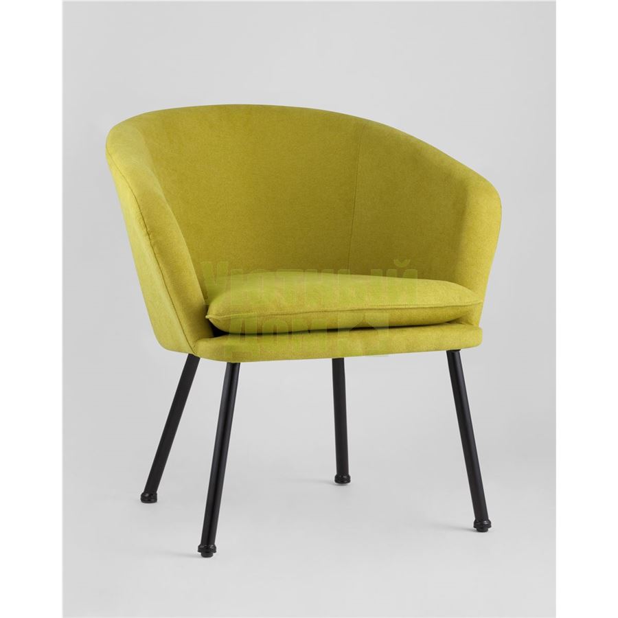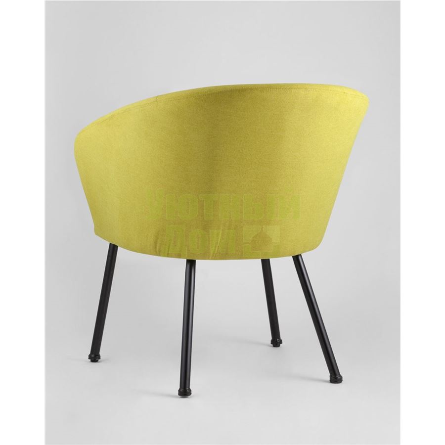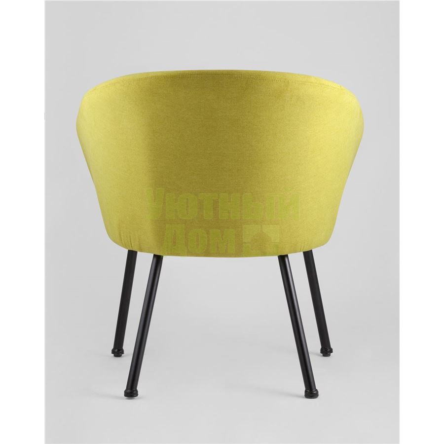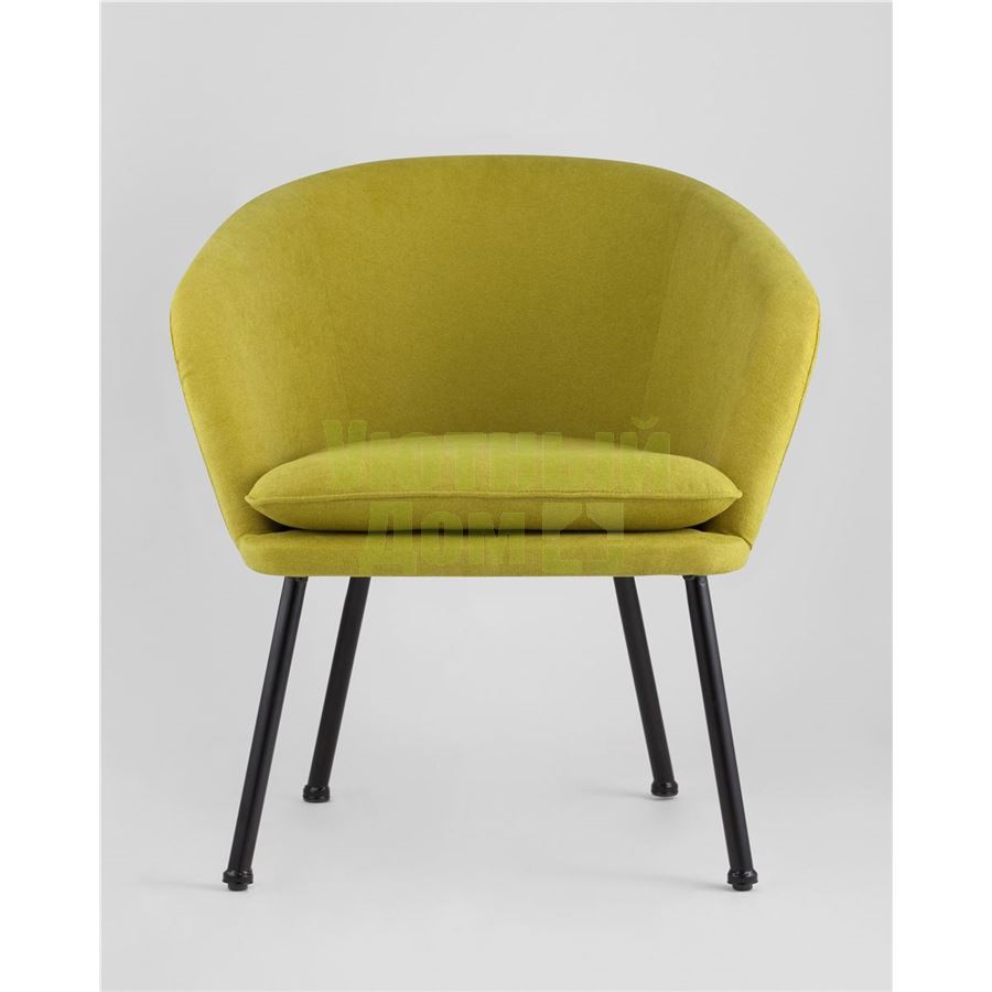 Широкая спинка плавно переходит в удобные подлокотники. Для дополнительного комфорта в кресле есть мягкое плотное сиденье. В качестве обивки используется ткань шенилл, плотный износостойкий материал с бархатистой структурой, приятный на ощупь. Металлический каркас добавляет устойчивости и выдерживает нагрузку до 120 кг. Ножки металлические черные.