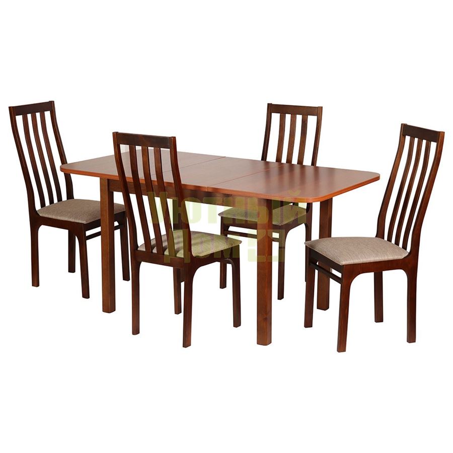 Обеденная группа состоит из стола и 4 стульев.Столешница выполнена из ламинированной плиты толщиной 22 мм. При помощи цельной вставки (40 см) длина стола увеличивается до 150 см. Углы столешницы скруглены.