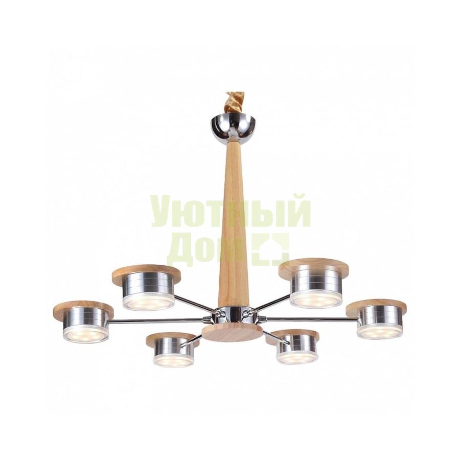 Гарантия, месяцы: 24; Диапазон рабочих температур: +1-[+35]; Класс электробезопасности: I; Напряжение питания лампы, В: 220; Степень пылевлагозащиты, IP: 20; Направление плафонов: вниз; Количество плафонов: 6; Общее кол-во ламп: 6; Форма плафонов: цилиндр круглый; Поверхность арматуры: глянцевый,матовый; Диаметр, мм: 600; Поверхность плафонов и подвесок: глянцевый,матовый; Площадь освещения, м2: 15; Материал арматуры: дерево, металл; Основной ма...