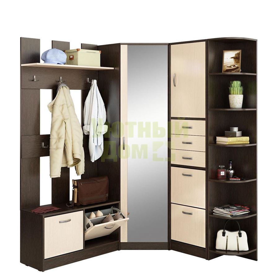 Каждый элемент возможно приобрести по отдельности. Состав комплекта: обувницы с вешалкой Ольга (ОВ) (1 шт.), с ящиками и полками Ольга (ОЯП) (1 шт.), шкаф угловой с зеркалом Ольга (ШУЗ) (1 шт.), Угловой терминал Ольга (УТ-2000) (1 шт.).
