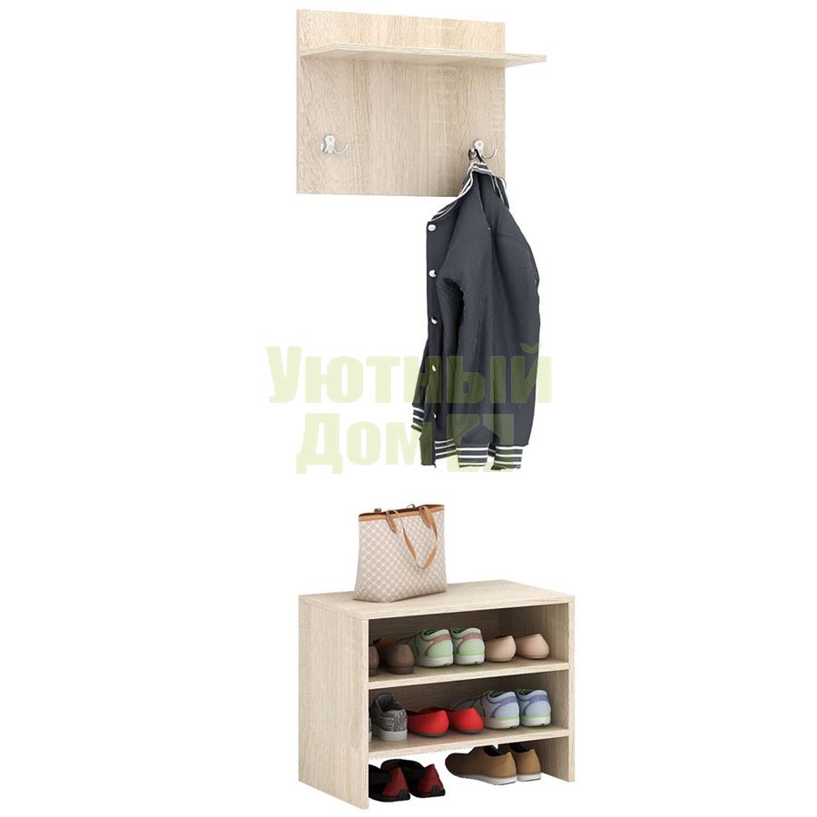 Каждый элемент возможно приобрести по отдельности. Состав комплекта: вешалка Уно-62 и обувница Уно-52. В зависимости от типа обуви, тумба для обуви способна вместить до 6 пар обуви. Аккуратные заглушки в тон мебели для скрытия технологических отверстий.