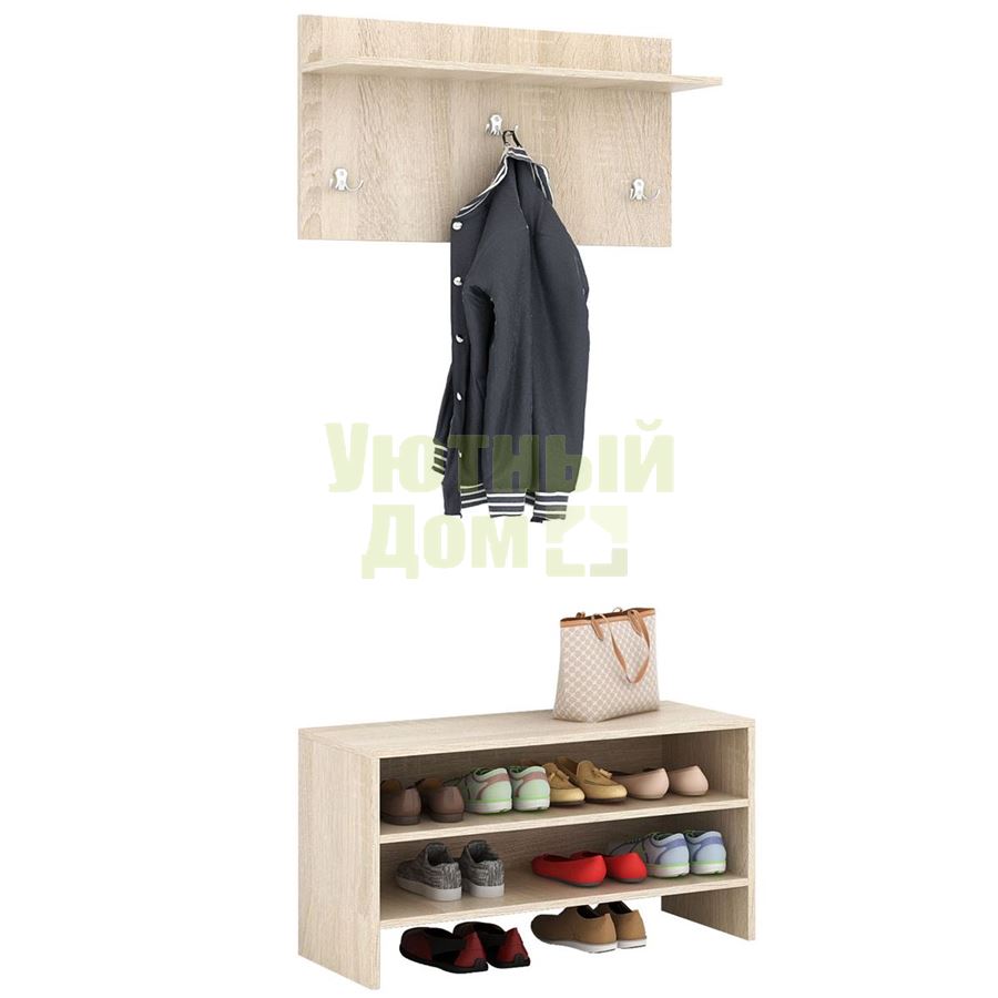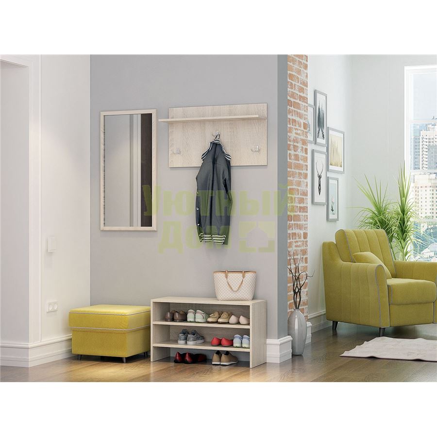 Каждый элемент возможно приобрести по отдельности. Состав комплекта: вешалка Уно-63 и обувница Уно-53. В зависимости от типа обуви, тумба для обуви способна вместить до 9 пар обуви. Аккуратные заглушки в тон мебели для скрытия технологических отверстий.