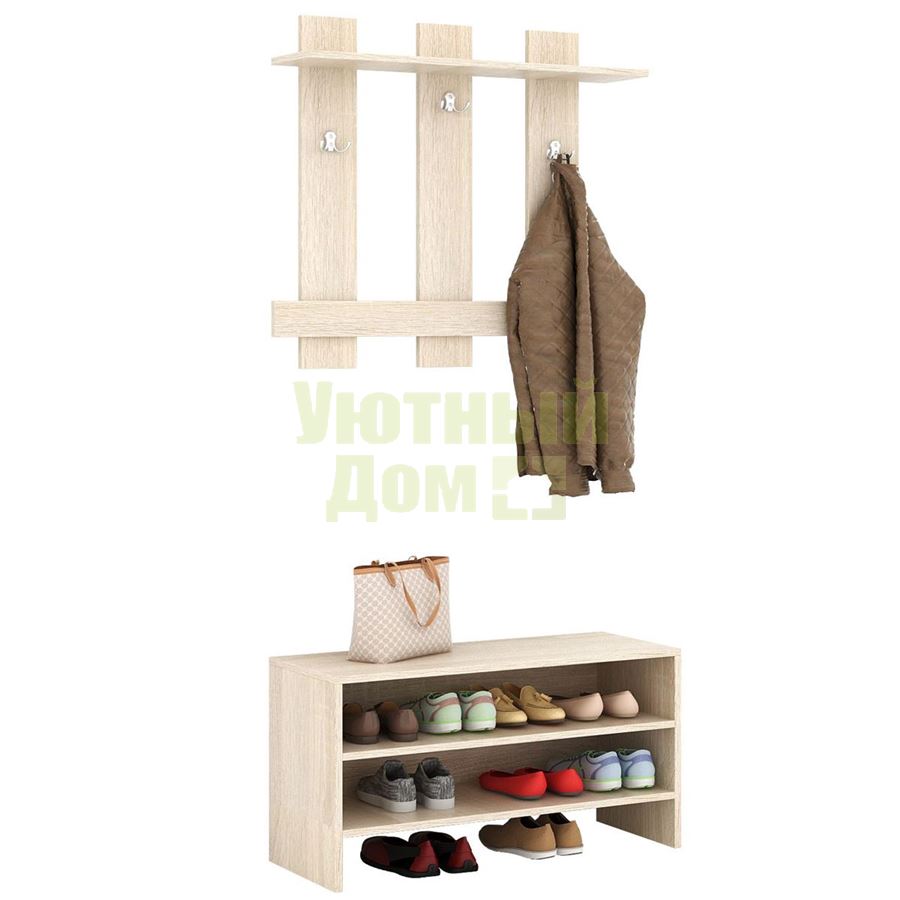 Каждый элемент возможно приобрести по отдельности. Состав комплекта: вешалка Уно-65 и обувница Уно-53. В зависимости от типа обуви, тумба для обуви способна вместить до 9 пар обуви. Аккуратные заглушки в тон мебели для скрытия технологических отверстий.