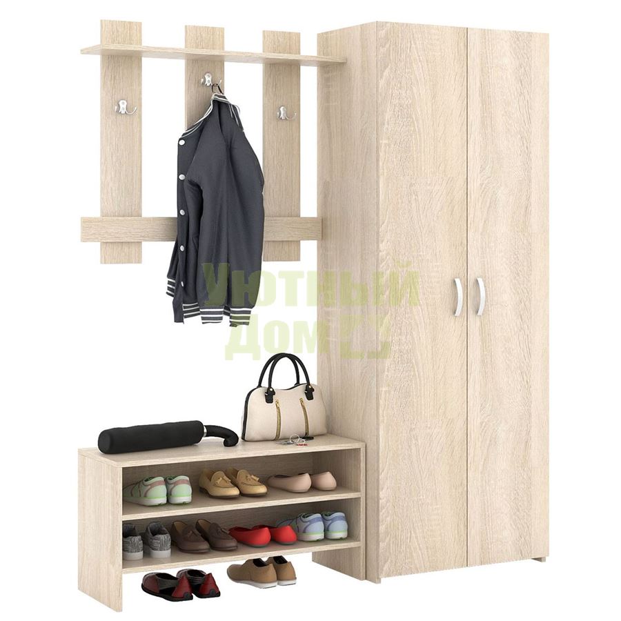Каждый элемент возможно приобрести по отдельности. Состав комплекта: вешалка Уно-65, обувница Уно-53 и шкаф для одежды Уно-35.