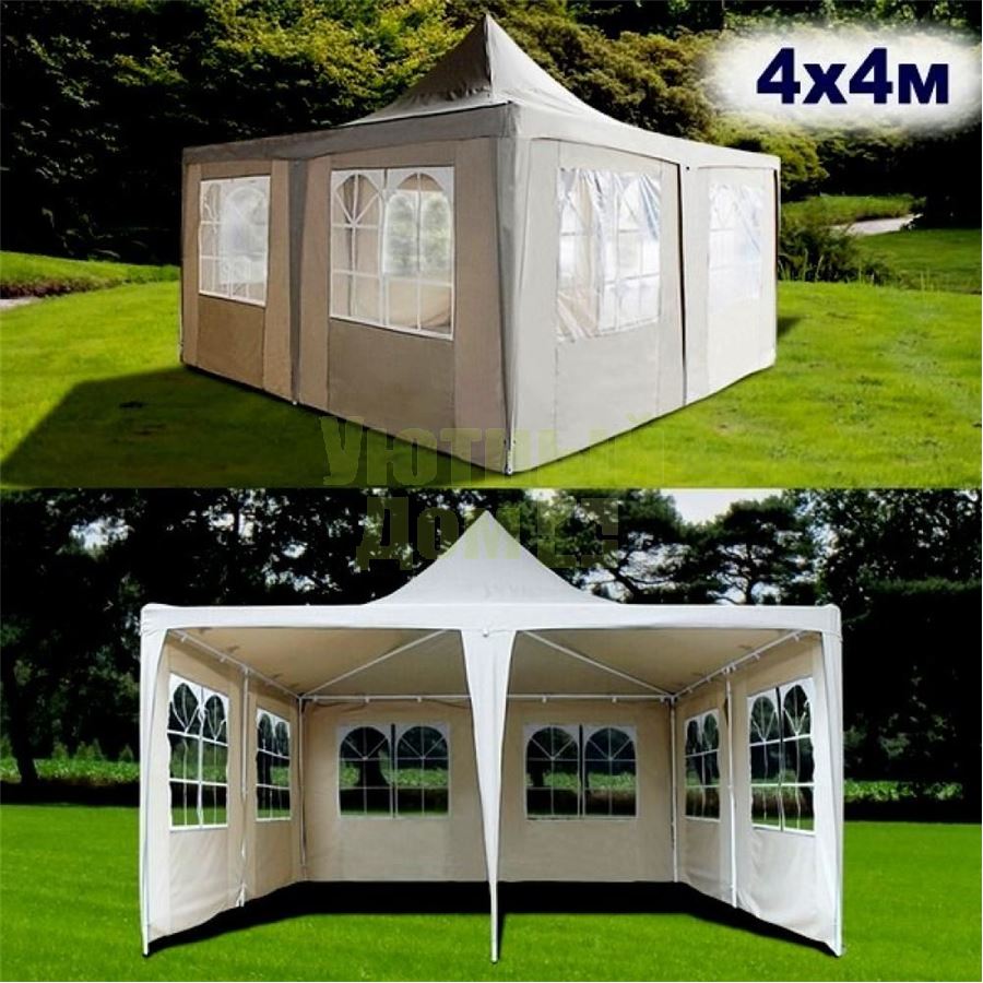 Размер: 4x4 м. Высота: в коньке 3,7 м. Каркас: труба сталь D32 мм. Материал: полиэстер - 260гр. С PVC покрытием крыши. Стенки: 2 стенки 4 м. с окнами и 4 стенки 2м. c окнами. Вес: 38 кг. (2 коробки) Цвет: бежевый.