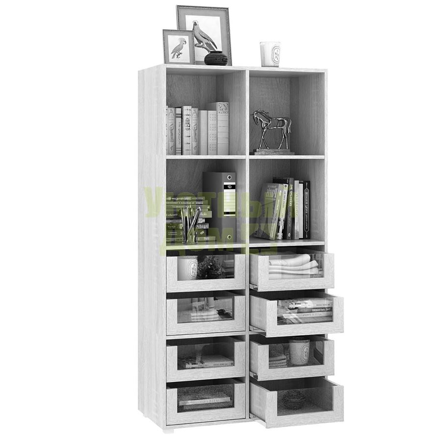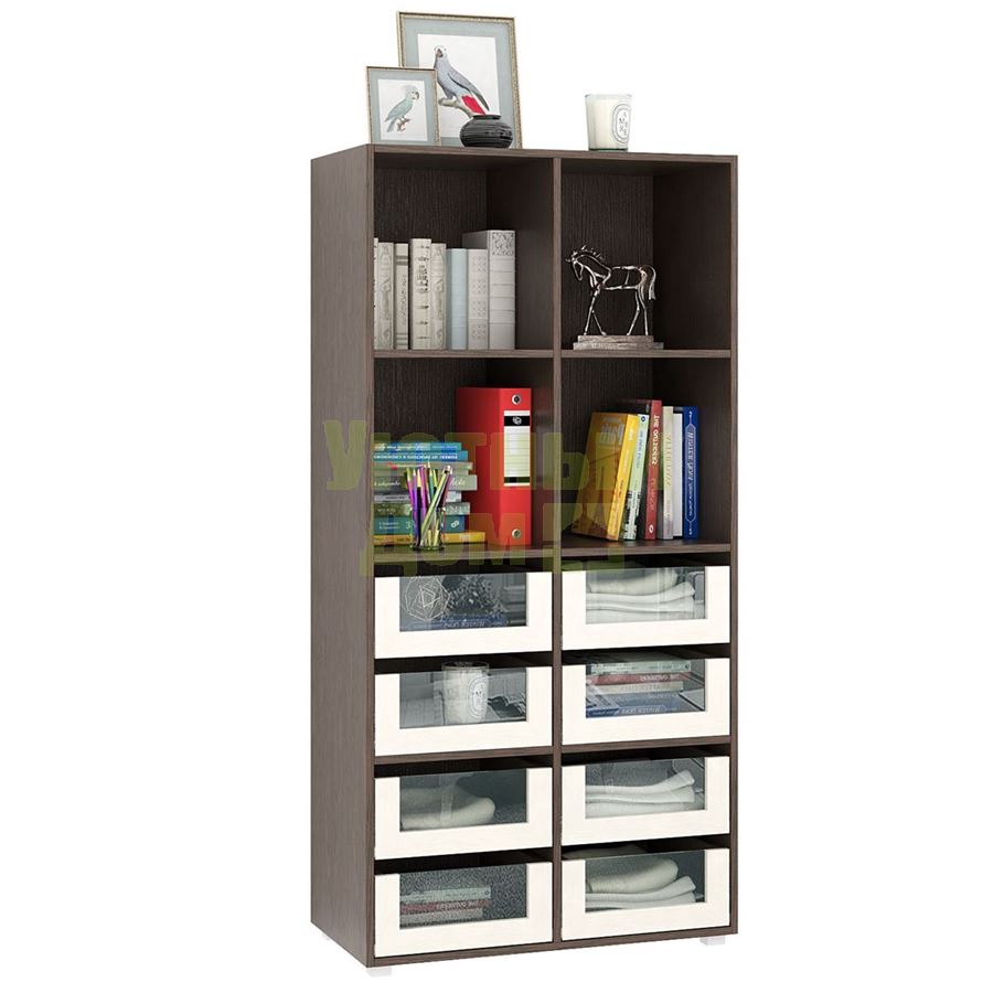 Стеллаж является комплектом модульной системы. Вы можете собрать индивидуальный комплект из корпуса и наполнения (дверок, блока ящиков, ящиков со стеклом или больших ящиков).