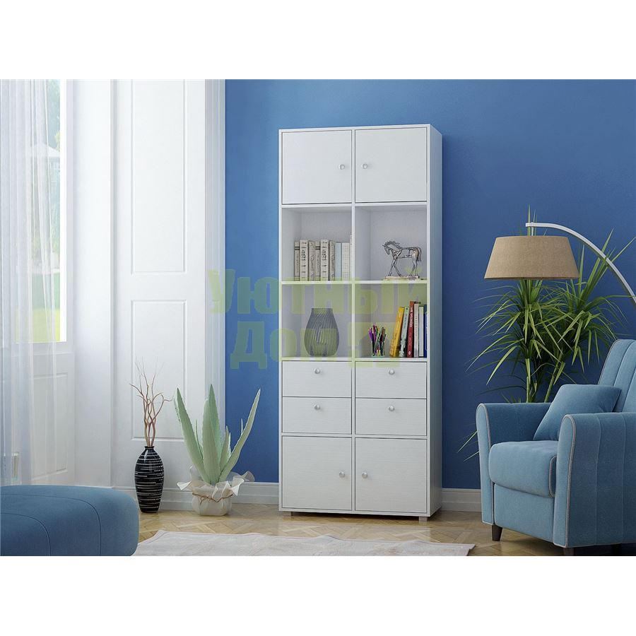 Стеллаж является комплектом модульной системы. Вы можете собрать индивидуальный комплект из корпуса и наполнения (дверок, блока ящиков, ящиков со стеклом или больших ящиков). Тип ручки: кнопка. Декоративные заглушки в тон мебели. Пластиковые опоры в комплекте. В выдвижных ящиках используются качественные роликовые направляющие. Сборку данного товара желательно осуществлять вдвоем во избежание травмоопасных ситуаций или механических повреждений мебели. Рекомендуем крепить к стене, чтобы предотвратить случайное опрокидывание мебели. Для разных стен требуются различные крепежи. Подберите подходящие для ваших стен шурупы, дюбели, саморезы и т. п. (не входят в комплект фурнитуры). Комплект состоит из: стеллажа Прайм-52 (1 шт.), дверцы Прайм (4 шт.), блока ящиков Прайм (2 шт.).