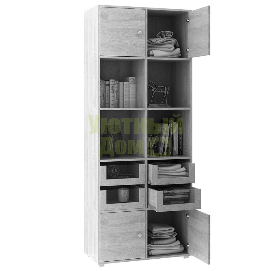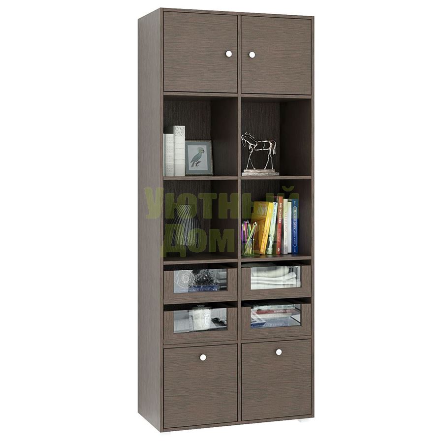 Стеллаж является комплектом модульной системы. Вы можете собрать индивидуальный комплект из корпуса и наполнения (дверок, блока ящиков, ящиков со стеклом или больших ящиков). Тип ручки: кнопка. Декоративные заглушки в тон мебели. Пластиковые опоры в комплекте. В выдвижных ящиках используются качественные роликовые направляющие. Сборку данного товара желательно осуществлять вдвоем во избежание травмоопасных ситуаций или механических повреждений мебели. Рекомендуем крепить к стене, чтобы предотвратить случайное опрокидывание мебели. Для разных стен требуются различные крепежи. Подберите подходящие для ваших стен шурупы, дюбели, саморезы и т. п. (не входят в комплект фурнитуры). Комплект состоит из: стеллажа Прайм-52 (1 шт.), дверцы Прайм (2 шт.), блока ящиков со стеклом Прайм (2 шт.), большого ящика Прайм (2 шт.).