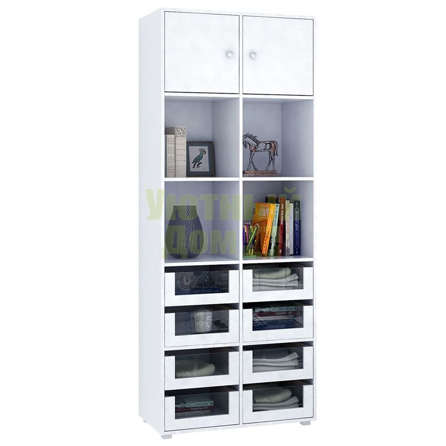 Стеллаж является комплектом модульной системы. Вы можете собрать индивидуальный комплект из корпуса и наполнения (дверок, блока ящиков, ящиков со стеклом или больших ящиков). Тип ручки: кнопка. Декоративные заглушки в тон мебели. Пластиковые опоры в комплекте. В выдвижных ящиках используются качественные роликовые направляющие. Сборку данного товара желательно осуществлять вдвоем во избежание травмоопасных ситуаций или механических повреждений мебели. Рекомендуем крепить к стене, чтобы предотвратить случайное опрокидывание мебели. Для разных стен требуются различные крепежи. Подберите подходящие для ваших стен шурупы, дюбели, саморезы и т. п. (не входят в комплект фурнитуры). Комплект состоит из: стеллажа Прайм-52 (1 шт.), дверцы Прайм (2 шт.), блока ящиков со стеклом Прайм (4 шт.).