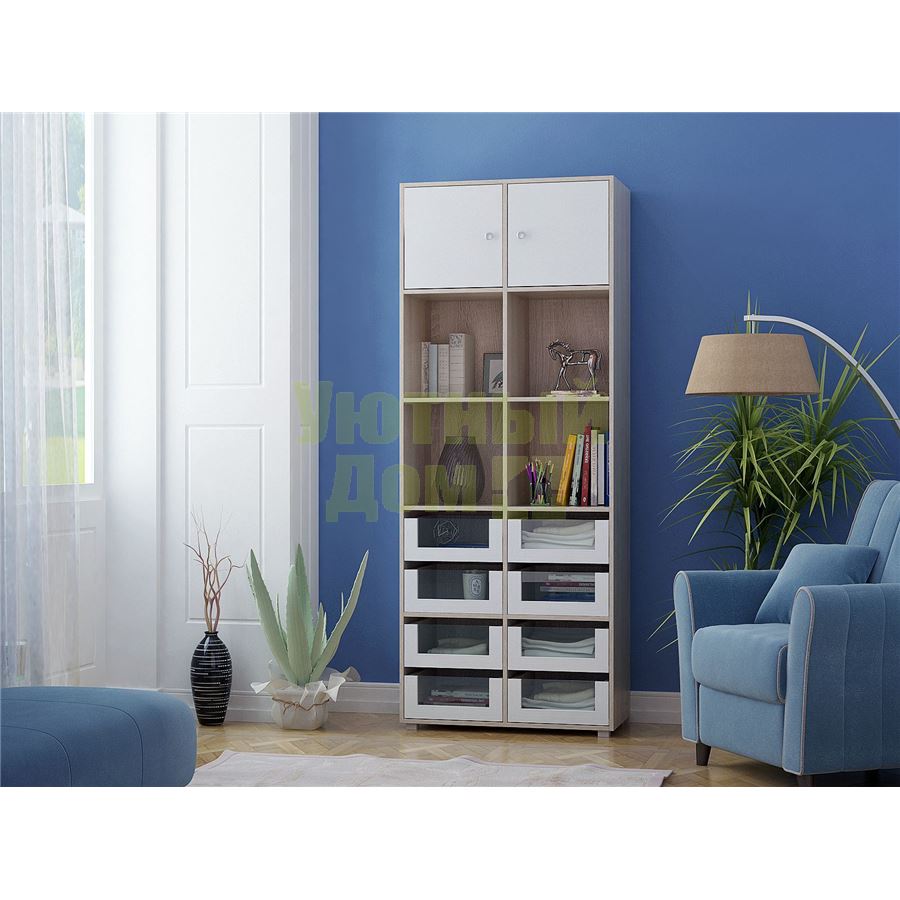 Стеллаж является комплектом модульной системы. Вы можете собрать индивидуальный комплект из корпуса и наполнения (дверок, блока ящиков, ящиков со стеклом или больших ящиков). Тип ручки: кнопка. Декоративные заглушки в тон мебели. Пластиковые опоры в комплекте. В выдвижных ящиках используются качественные роликовые направляющие. Сборку данного товара желательно осуществлять вдвоем во избежание травмоопасных ситуаций или механических повреждений мебели. Рекомендуем крепить к стене, чтобы предотвратить случайное опрокидывание мебели. Для разных стен требуются различные крепежи. Подберите подходящие для ваших стен шурупы, дюбели, саморезы и т. п. (не входят в комплект фурнитуры). Комплект состоит из: стеллажа Прайм-52 (1 шт.), дверцы Прайм (2 шт.), блока ящиков со стеклом Прайм (4 шт.).
