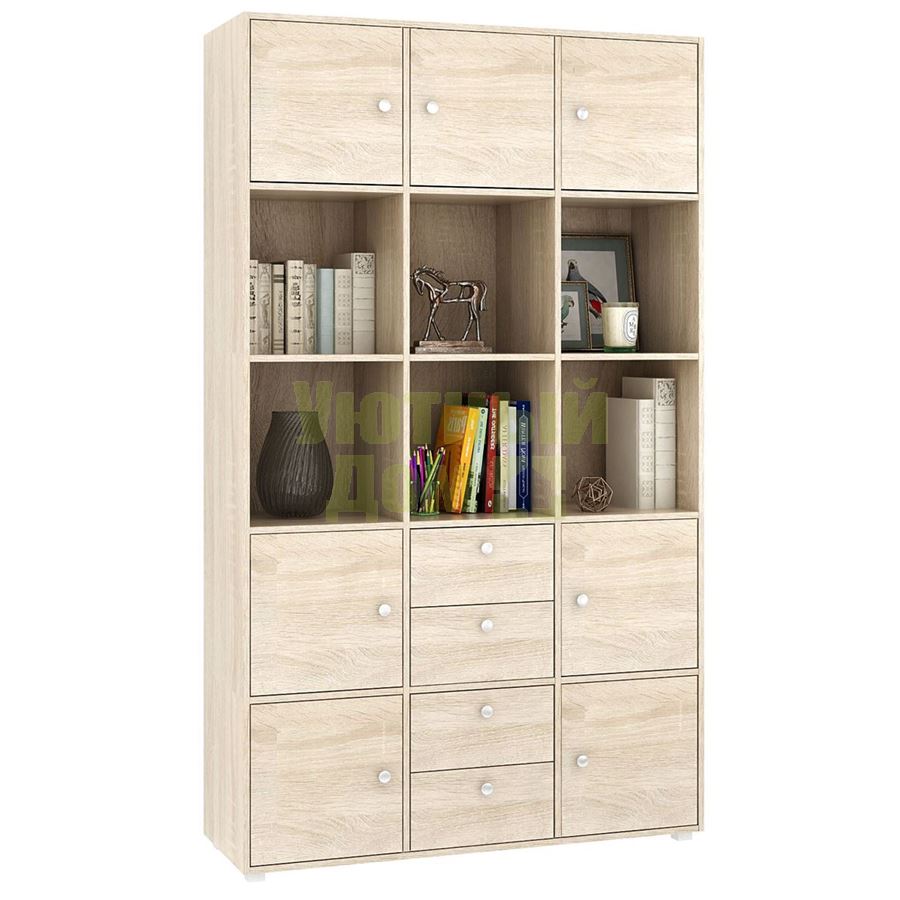 Стеллаж является комплектом модульной системы. Вы можете собрать индивидуальный комплект из корпуса и наполнения (дверок, блока ящиков, ящиков со стеклом или больших ящиков). Тип ручки: кнопка. Декоративные заглушки в тон мебели. Пластиковые опоры в комплекте. В выдвижных ящиках используются качественные роликовые направляющие. Сборку данного товара желательно осуществлять вдвоем во избежание травмоопасных ситуаций или механических повреждений мебели. Рекомендуем крепить к стене, чтобы предотвратить случайное опрокидывание мебели. Для разных стен требуются различные крепежи. Подберите подходящие для ваших стен шурупы, дюбели, саморезы и т. п. (не входят в комплект фурнитуры). Комплект состоит из: стеллажа Прайм-53 (1 шт.), дверцы Прайм (7 шт.), блока ящиков Прайм (2 шт.).
