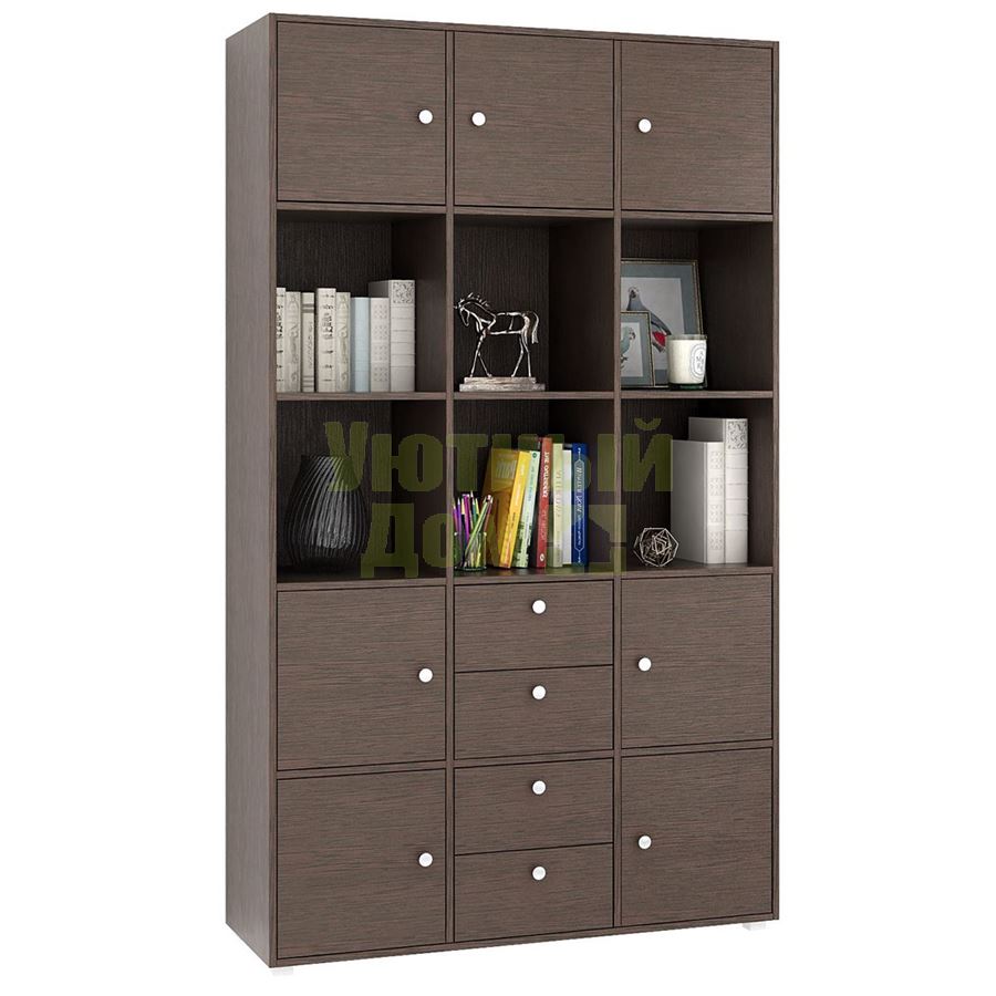 Стеллаж является комплектом модульной системы. Вы можете собрать индивидуальный комплект из корпуса и наполнения (дверок, блока ящиков, ящиков со стеклом или больших ящиков). Тип ручки: кнопка. Декоративные заглушки в тон мебели. Пластиковые опоры в комплекте. В выдвижных ящиках используются качественные роликовые направляющие. Сборку данного товара желательно осуществлять вдвоем во избежание травмоопасных ситуаций или механических повреждений мебели. Рекомендуем крепить к стене, чтобы предотвратить случайное опрокидывание мебели. Для разных стен требуются различные крепежи. Подберите подходящие для ваших стен шурупы, дюбели, саморезы и т. п. (не входят в комплект фурнитуры). Комплект состоит из: стеллажа Прайм-53 (1 шт.), дверцы Прайм (7 шт.), блока ящиков Прайм (2 шт.).