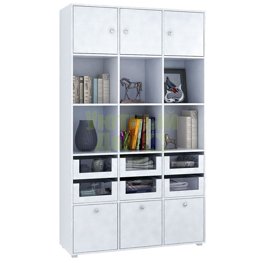 Стеллаж является комплектом модульной системы. Вы можете собрать индивидуальный комплект из корпуса и наполнения (дверок, блока ящиков, ящиков со стеклом или больших ящиков). Тип ручки: кнопка. Декоративные заглушки в тон мебели. Пластиковые опоры в комплекте. В выдвижных ящиках используются качественные роликовые направляющие. Сборку данного товара желательно осуществлять вдвоем во избежание травмоопасных ситуаций или механических повреждений мебели. Рекомендуем крепить к стене, чтобы предотвратить случайное опрокидывание мебели. Для разных стен требуются различные крепежи. Подберите подходящие для ваших стен шурупы, дюбели, саморезы и т. п. (не входят в комплект фурнитуры). Комплект состоит из: стеллажа Прайм-53 (1 шт.), дверцы Прайм (3 шт.), блока ящиков со стеклом Прайм (3 шт.), большого ящика Прайм (3 шт.).