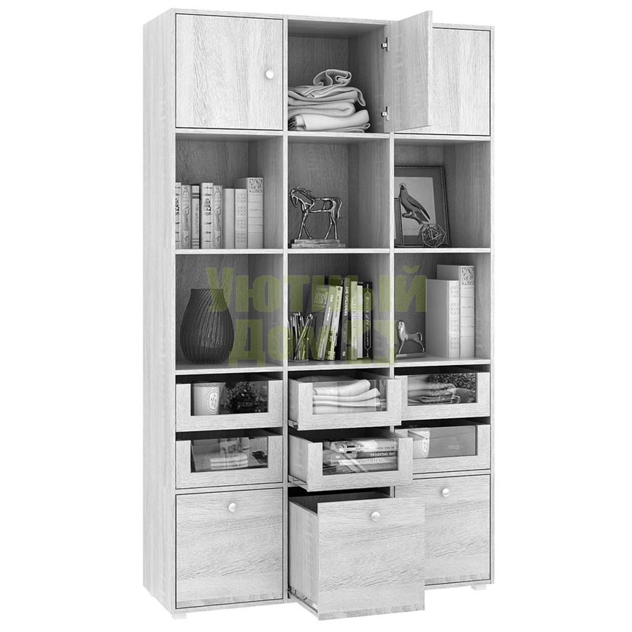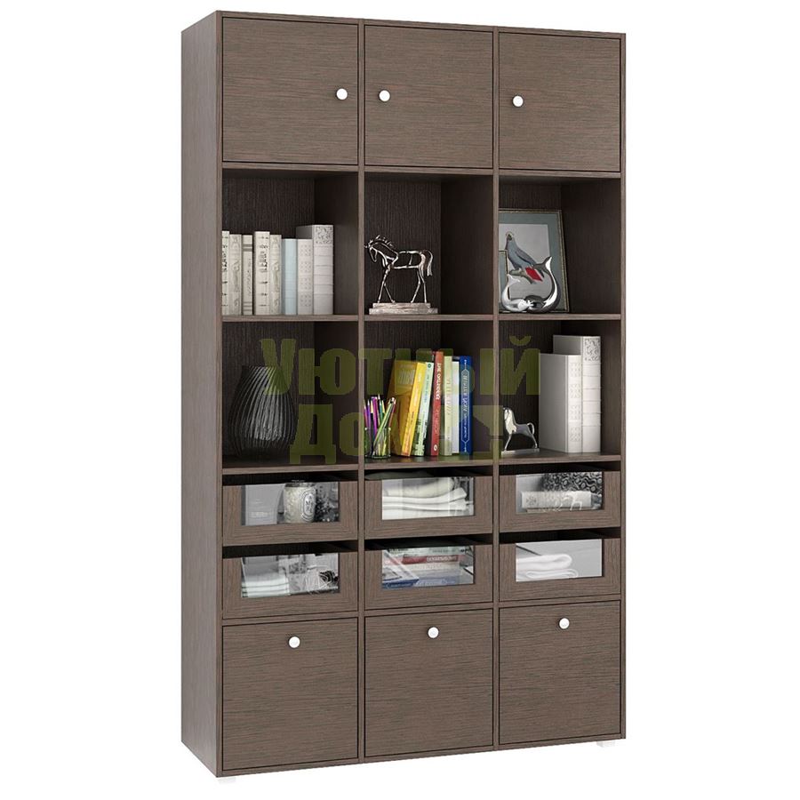 Стеллаж является комплектом модульной системы. Вы можете собрать индивидуальный комплект из корпуса и наполнения (дверок, блока ящиков, ящиков со стеклом или больших ящиков). Тип ручки: кнопка. Декоративные заглушки в тон мебели. Пластиковые опоры в комплекте. В выдвижных ящиках используются качественные роликовые направляющие. Сборку данного товара желательно осуществлять вдвоем во избежание травмоопасных ситуаций или механических повреждений мебели. Рекомендуем крепить к стене, чтобы предотвратить случайное опрокидывание мебели. Для разных стен требуются различные крепежи. Подберите подходящие для ваших стен шурупы, дюбели, саморезы и т. п. (не входят в комплект фурнитуры). Комплект состоит из: стеллажа Прайм-53 (1 шт.), дверцы Прайм (3 шт.), блока ящиков со стеклом Прайм (3 шт.), большого ящика Прайм (3 шт.).