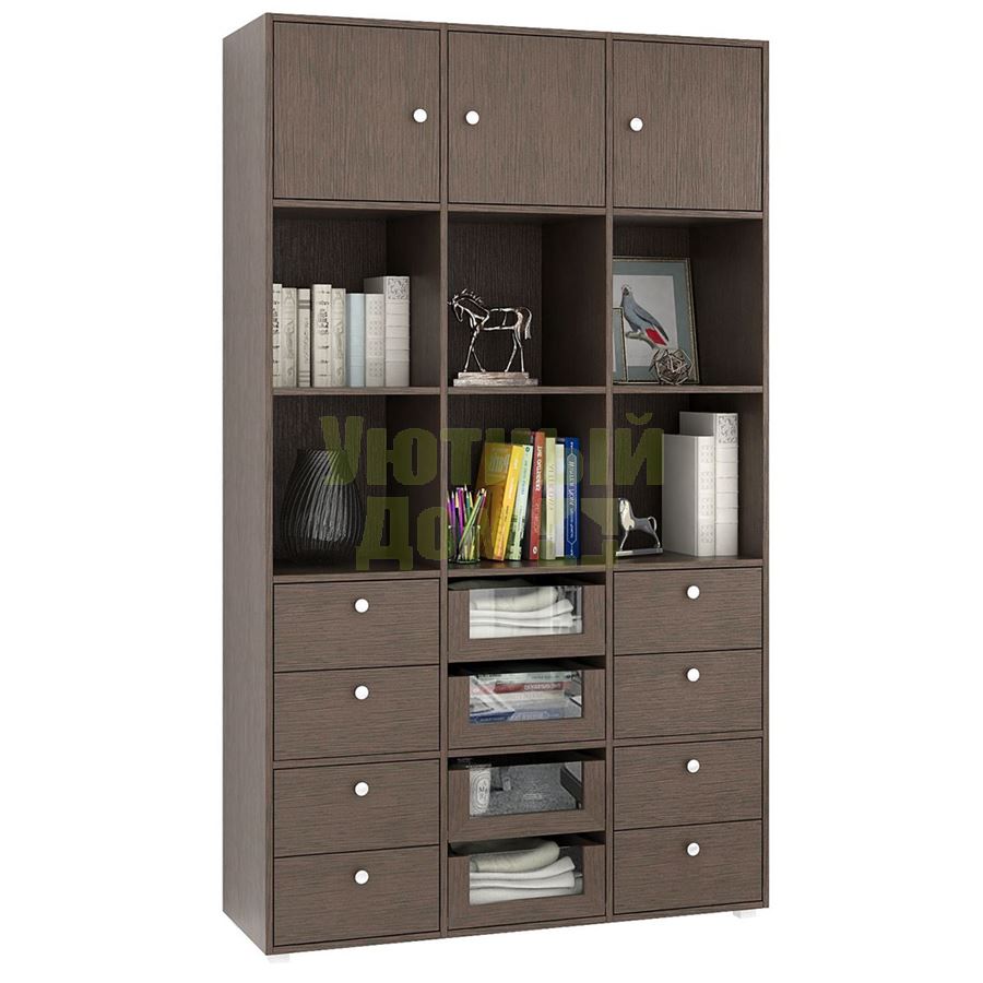 Стеллаж является комплектом модульной системы. Вы можете собрать индивидуальный комплект из корпуса и наполнения (дверок, блока ящиков, ящиков со стеклом или больших ящиков). Тип ручки: кнопка. Декоративные заглушки в тон мебели. Пластиковые опоры в комплекте. В выдвижных ящиках используются качественные роликовые направляющие. Сборку данного товара желательно осуществлять вдвоем во избежание травмоопасных ситуаций или механических повреждений мебели. Рекомендуем крепить к стене, чтобы предотвратить случайное опрокидывание мебели. Для разных стен требуются различные крепежи. Подберите подходящие для ваших стен шурупы, дюбели, саморезы и т. п. (не входят в комплект фурнитуры). Комплект состоит из: стеллажа Прайм-53 (1 шт.), дверцы Прайм (3 шт.), блока ящиков Прайм (4 шт.), блока ящиков со стеклом Прайм (2 шт.).