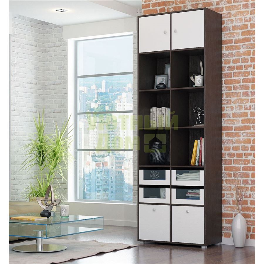 Стеллаж является комплектом модульной системы. Вы можете собрать индивидуальный комплект из корпуса и наполнения (дверок, блока ящиков, ящиков со стеклом или больших ящиков).