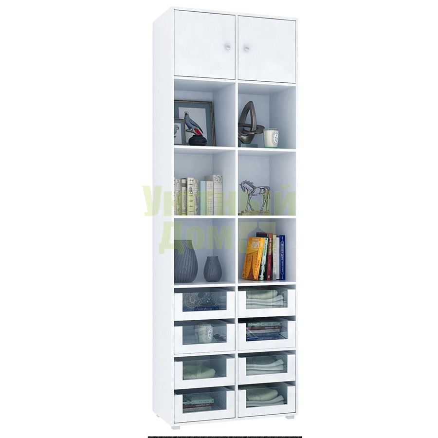 Стеллаж является комплектом модульной системы. Вы можете собрать индивидуальный комплект из корпуса и наполнения (дверок, блока ящиков, ящиков со стеклом или больших ящиков).