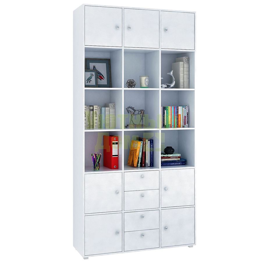 Стеллаж является комплектом модульной системы. Вы можете собрать индивидуальный комплект из корпуса и наполнения (дверок, блока ящиков, ящиков со стеклом или больших ящиков).