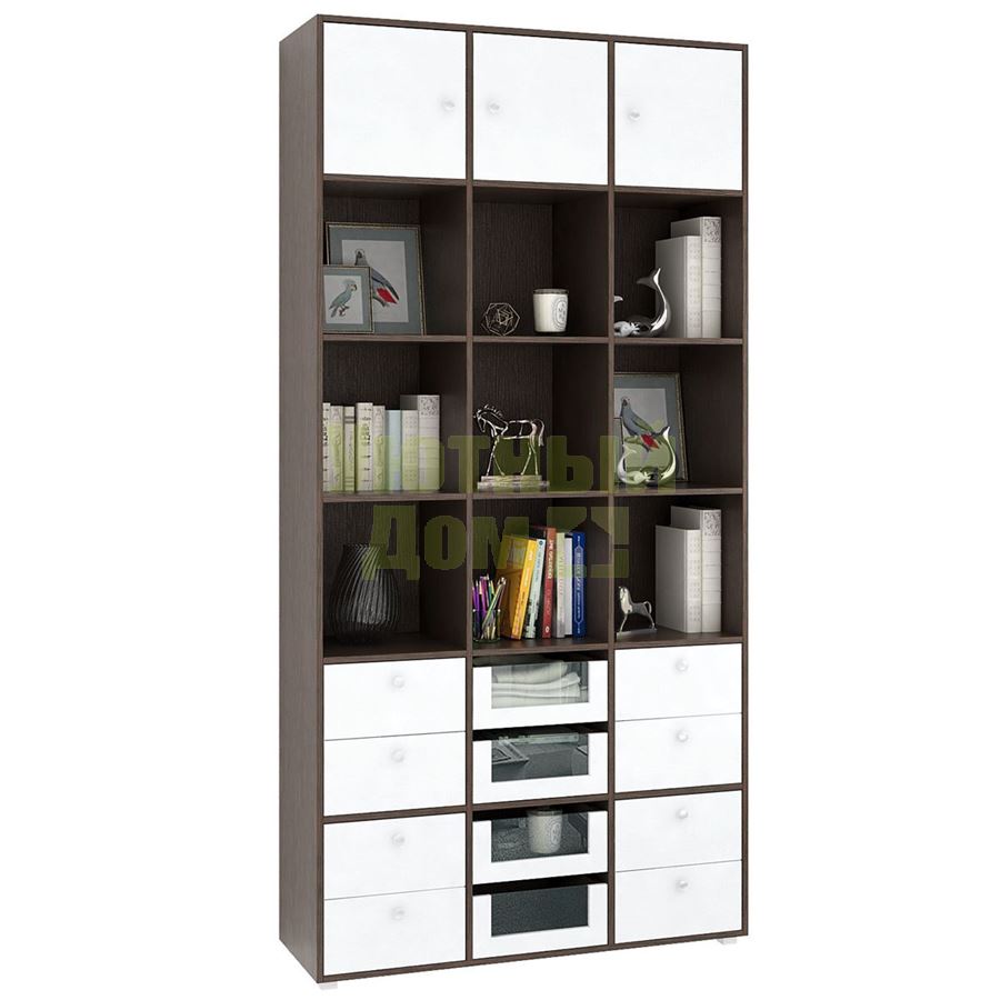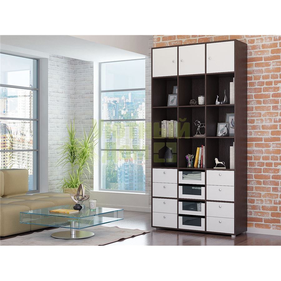 Стеллаж является комплектом модульной системы. Вы можете собрать индивидуальный комплект из корпуса и наполнения (дверок, блока ящиков, ящиков со стеклом или больших ящиков).