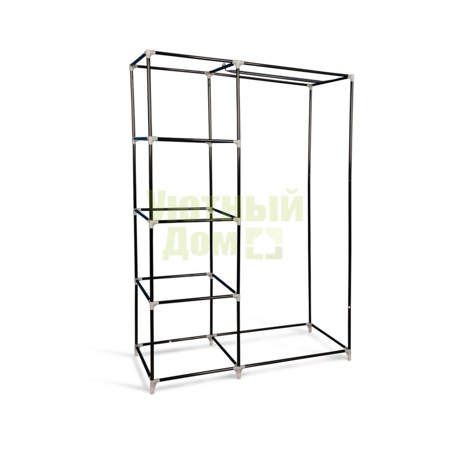 Стойка оснащена чехлом из плотной ткани, внутри размещается три полки и металлическая штанга для вешалок-плечиков.