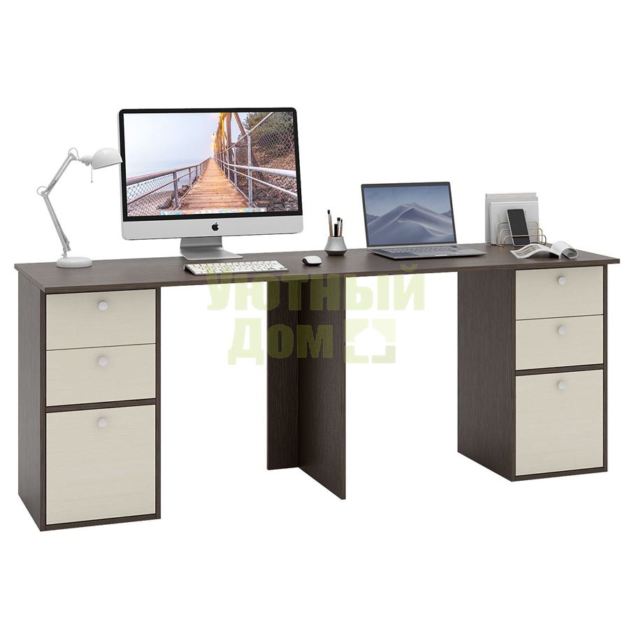 Стол является комплектом модульной системы Прайм. Вы можете собрать индивидуальный комплект из столешниц разных размеров, тумб разных форм и их наполнений (дверок, блока ящиков, ящиков со стеклом или больших ящиков). Тип ручки: кнопка. Декоративные заглушки в тон мебели. Войлочные и пластиковые подпятники. В выдвижных ящиках используются качественные роликовые направляющие. Сборку данного товара желательно осуществлять вдвоем во избежание травмоопасных ситуаций или механических повреждений мебели. Комплект состоит из: столешницы Прайм-20 (1 шт.), полки-тумбы Прайм-21 (2 шт.), блока ящиков Прайм (2 шт.), большого ящика Прайм (2 шт.)