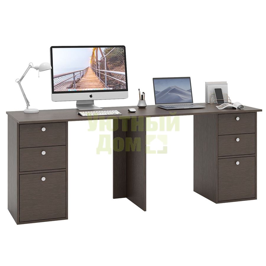 Стол является комплектом модульной системы Прайм. Вы можете собрать индивидуальный комплект из столешниц разных размеров, тумб разных форм и их наполнений (дверок, блока ящиков, ящиков со стеклом или больших ящиков). Тип ручки: кнопка. Декоративные заглушки в тон мебели. Войлочные и пластиковые подпятники. В выдвижных ящиках используются качественные роликовые направляющие. Сборку данного товара желательно осуществлять вдвоем во избежание травмоопасных ситуаций или механических повреждений мебели. Комплект состоит из: столешницы Прайм-20 (1 шт.), полки-тумбы Прайм-21 (2 шт.), блока ящиков Прайм (2 шт.), большого ящика Прайм (2 шт.)