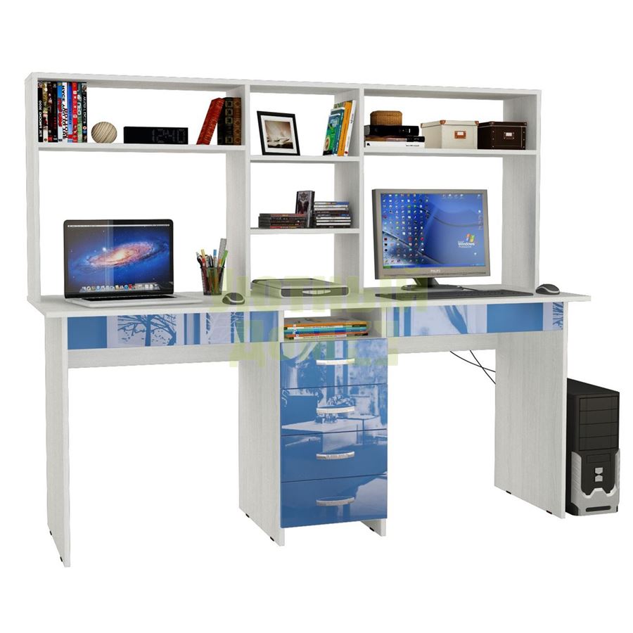 Купить Стол письменный Тандем-2Я Глянец, с надставкой белый / синий