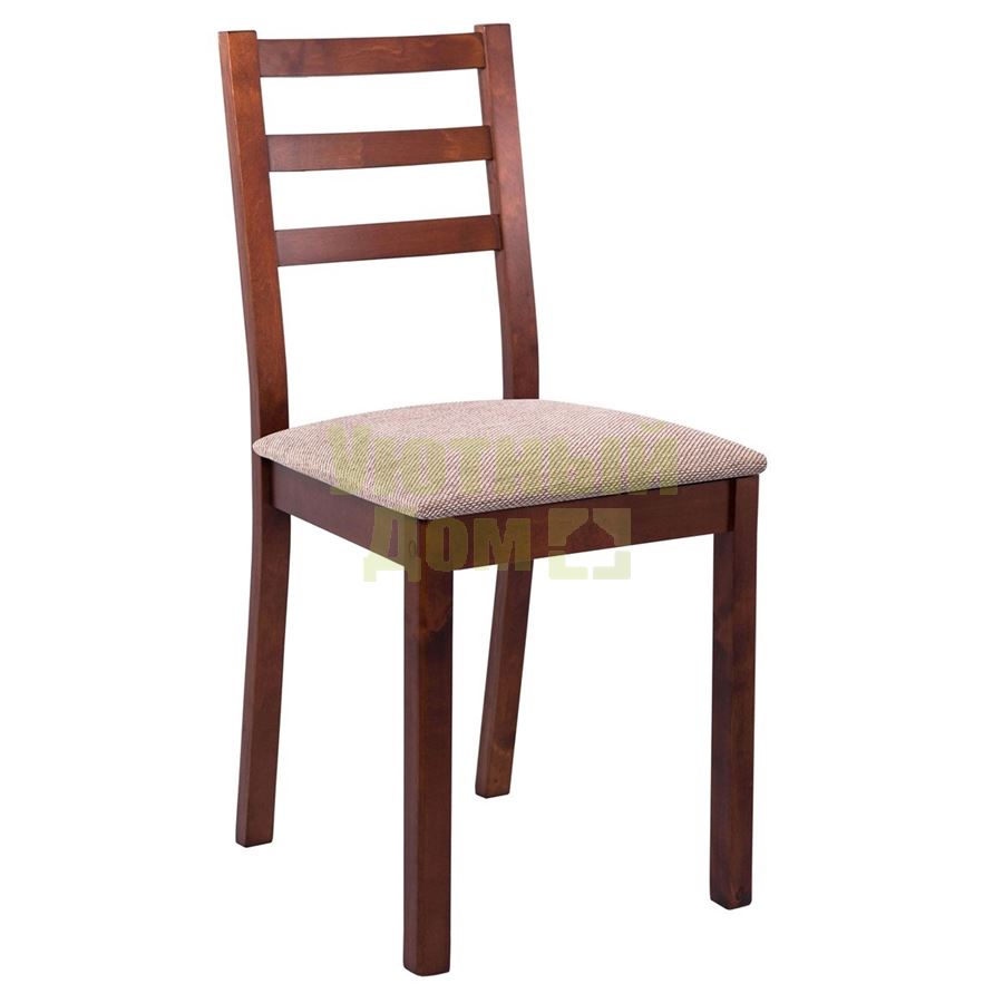 Деревянный обеденный стул с мягким сиденьем. Накладное сиденье обито прочной мебельной тканью.. Конструкция стула состоит из заднего и двух боковых комбинатов, соединенных между собой царгой и винтовыми стяжками. Все детали стула имеют скошенные углы. Спинка оформлена тремя гнутыми горизонтальными брусками.