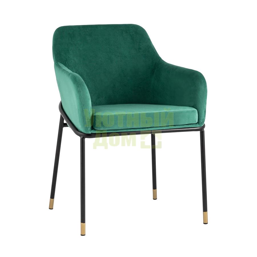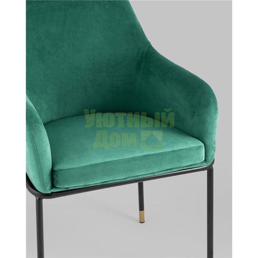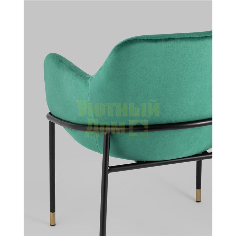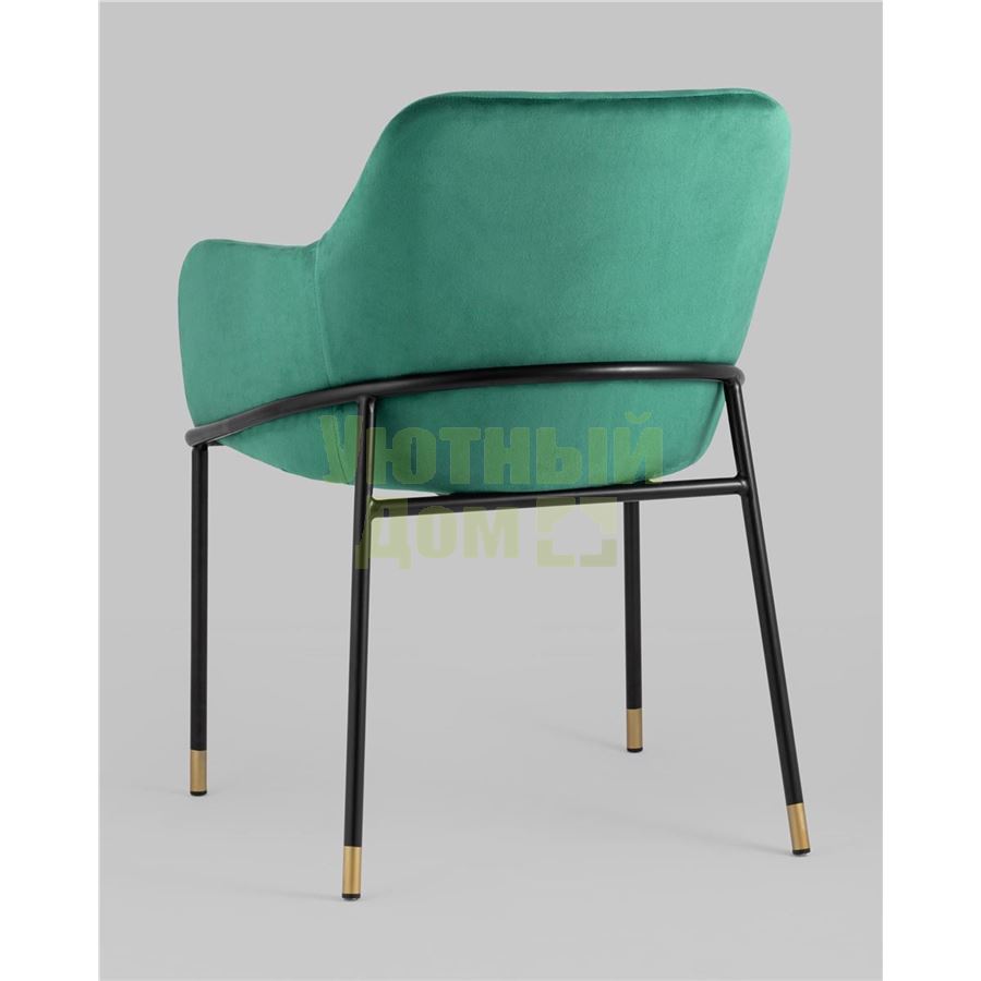 Стул с эргономичной посадкой, мягким сиденьем и широкой удобной спинкой и мягкими подлокотниками. Каркас и ножки черного матового цвета изготовлены из прочного металла с золотым декором, обивка из велюра - износостойкого материала с приятной на ощупь структурой.
