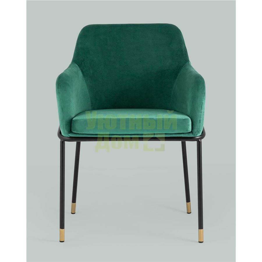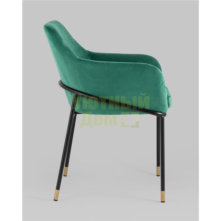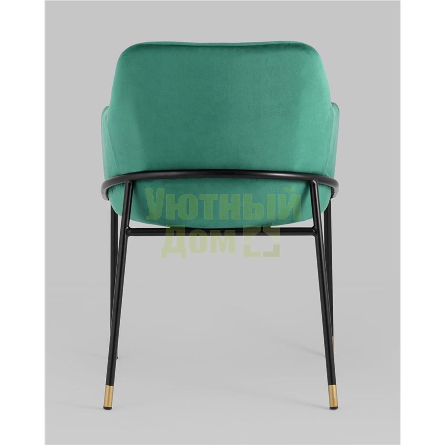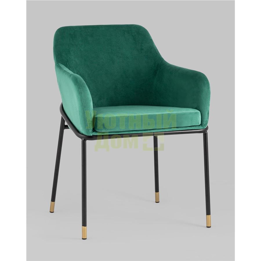 Стул с эргономичной посадкой, мягким сиденьем и широкой удобной спинкой и мягкими подлокотниками. Каркас и ножки черного матового цвета изготовлены из прочного металла с золотым декором, обивка из велюра - износостойкого материала с приятной на ощупь структурой.