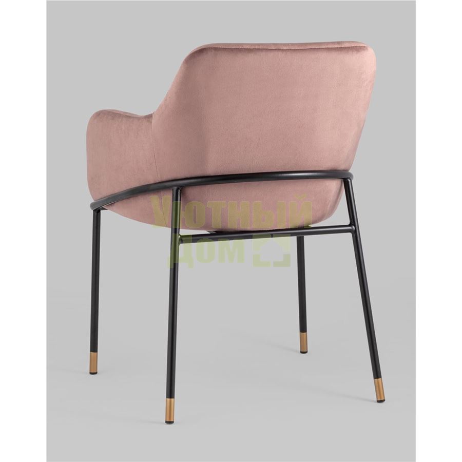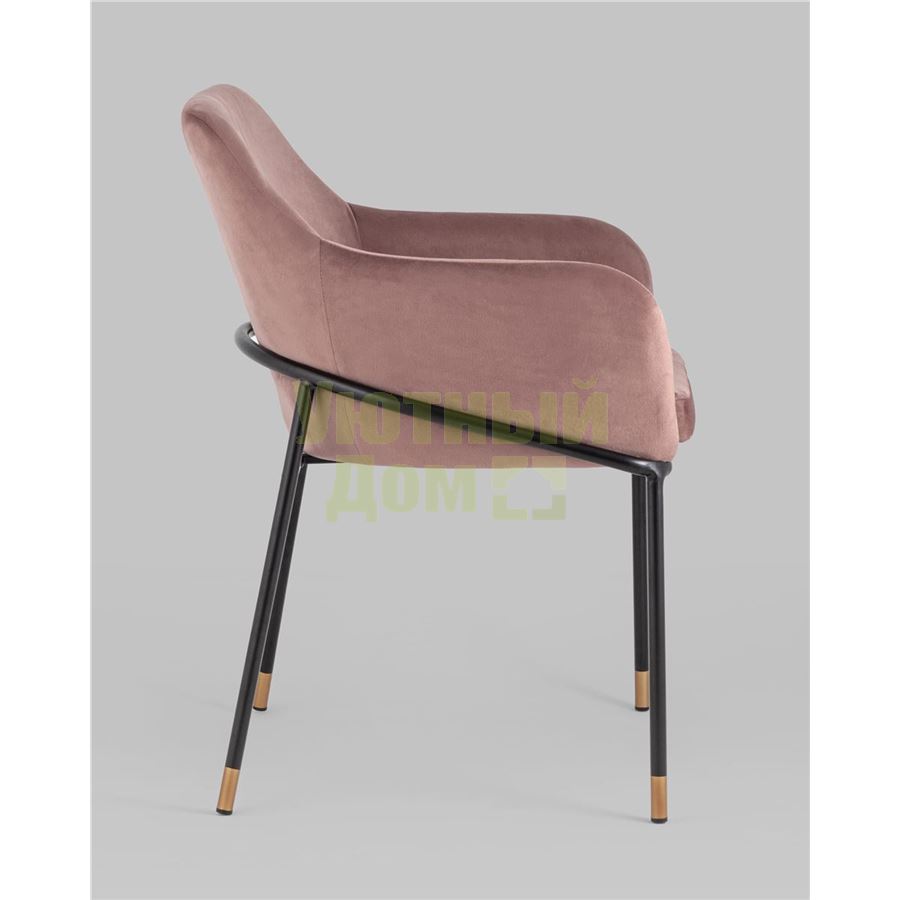 Стул с эргономичной посадкой, мягким сиденьем и широкой удобной спинкой и мягкими подлокотниками. Каркас и ножки черного матового цвета изготовлены из прочного металла с золотым декором, обивка из велюра - износостойкого материала с приятной на ощупь структурой.