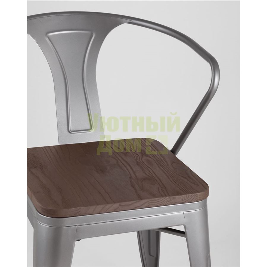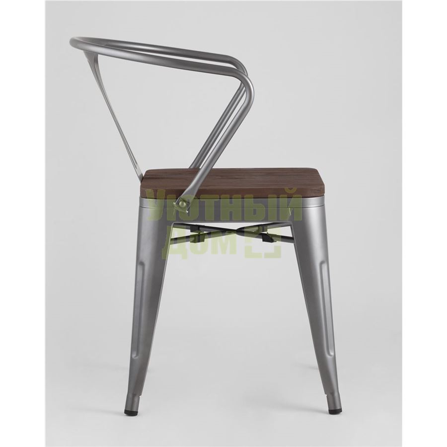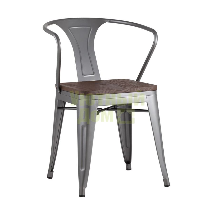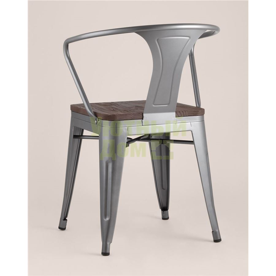 Стул Tolix с подлокотниками серебристый матовый + темное дерево, , металлическое серебристое основани доставляется в пределах МКАД бесплатно, при отправке в регионы России - бесплатно сдадим в ТК ПЭК.