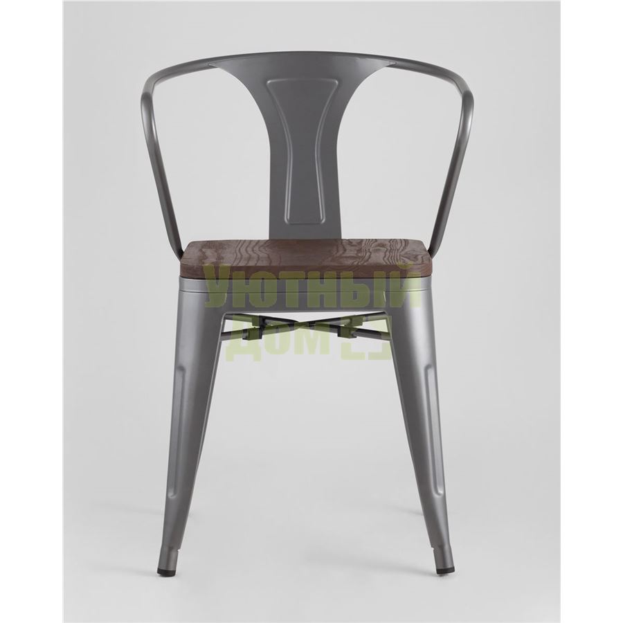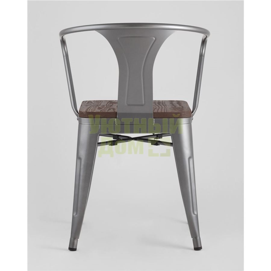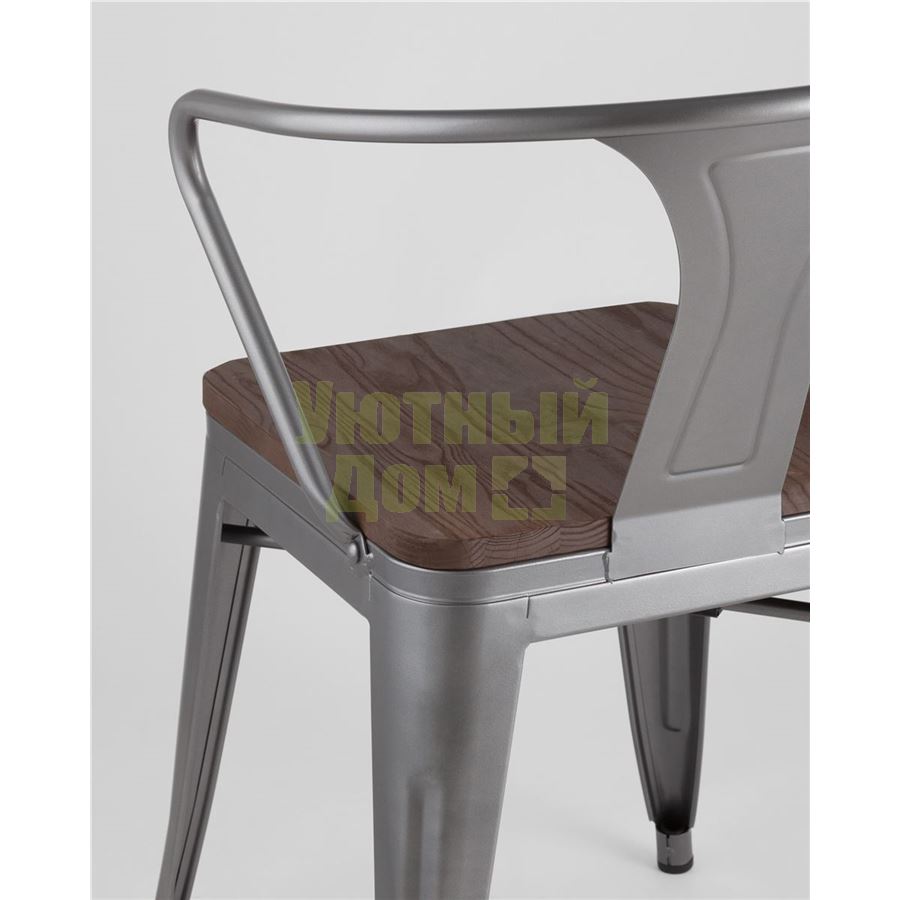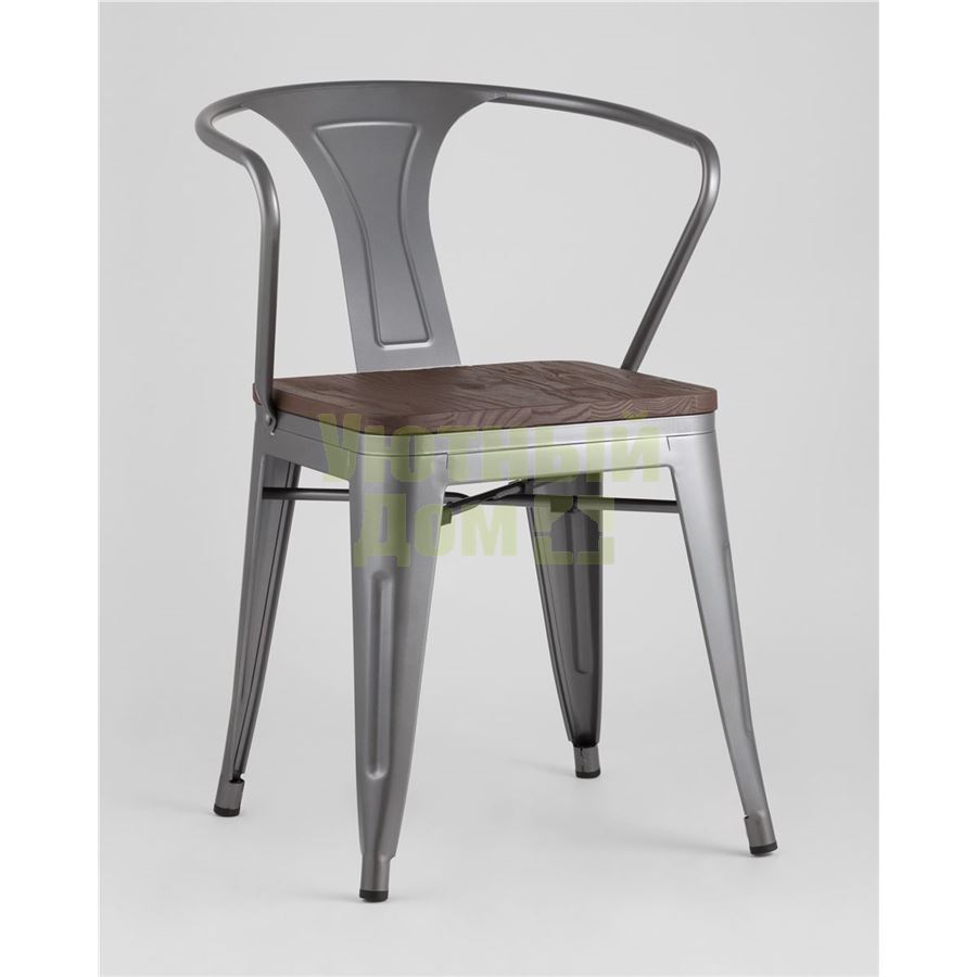 Стул Tolix с подлокотниками серебристый матовый + темное дерево, , металлическое серебристое основани доставляется в пределах МКАД бесплатно, при отправке в регионы России - бесплатно сдадим в ТК ПЭК.