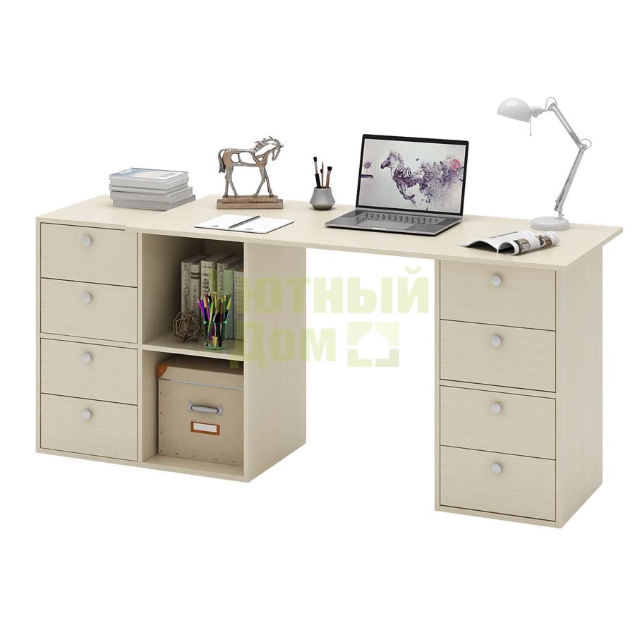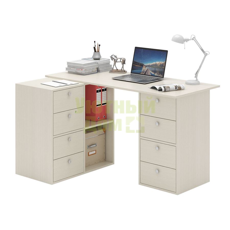Стол является комплектом модульной системы Прайм. Вы можете собрать индивидуальный комплект из столешниц разных размеров, тумб разных форм и их наполнений (дверок, блока ящиков, ящиков со стеклом или больших ящиков). Тип ручки: кнопка. Декоративные заглушки в тон мебели. Войлочные и пластиковые подпятники. В выдвижных ящиках используются качественные роликовые направляющие. Сборку данного товара желательно осуществлять вдвоем во избежание травмоопасных ситуаций или механических повреждений мебели. Комплект состоит из: столешницы Прайм-14 (1 шт.), полки-тумбы Прайм-21 (1 шт.), тумбы Прайм-22 (1 шт.), блока ящиков Прайм (4 шт.) Стол можно собрать как в правом, так и в левом исполнении. Благодаря универсальности конструкции, вы можете установить как прямой, так и угловой вариант стола.