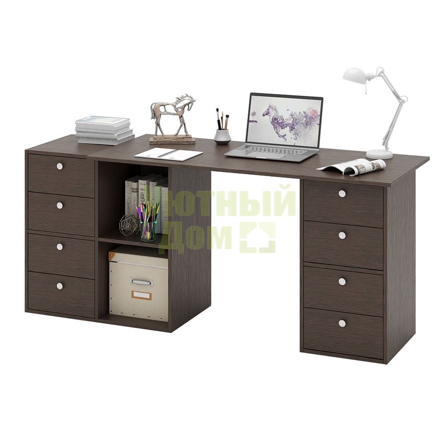 Стол является комплектом модульной системы Прайм. Вы можете собрать индивидуальный комплект из столешниц разных размеров, тумб разных форм и их наполнений (дверок, блока ящиков, ящиков со стеклом или больших ящиков). Тип ручки: кнопка. Декоративные заглушки в тон мебели. Войлочные и пластиковые подпятники. В выдвижных ящиках используются качественные роликовые направляющие. Сборку данного товара желательно осуществлять вдвоем во избежание травмоопасных ситуаций или механических повреждений мебели. Комплект состоит из: столешницы Прайм-14 (1 шт.), полки-тумбы Прайм-21 (1 шт.), тумбы Прайм-22 (1 шт.), блока ящиков Прайм (4 шт.) Стол можно собрать как в правом, так и в левом исполнении. Благодаря универсальности конструкции, вы можете установить как прямой, так и угловой вариант стола.