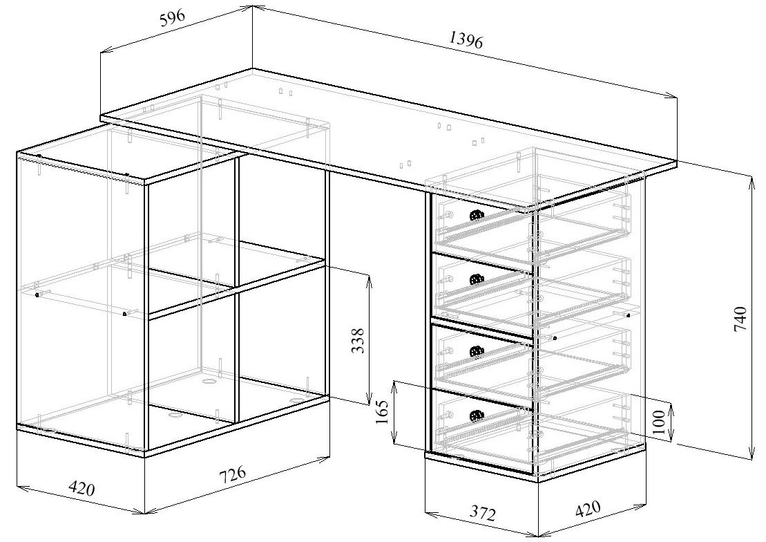 Стол является комплектом модульной системы Прайм. Вы можете собрать индивидуальный комплект из столешниц разных размеров, тумб разных форм и их наполнений (дверок, блока ящиков, ящиков со стеклом или больших ящиков).