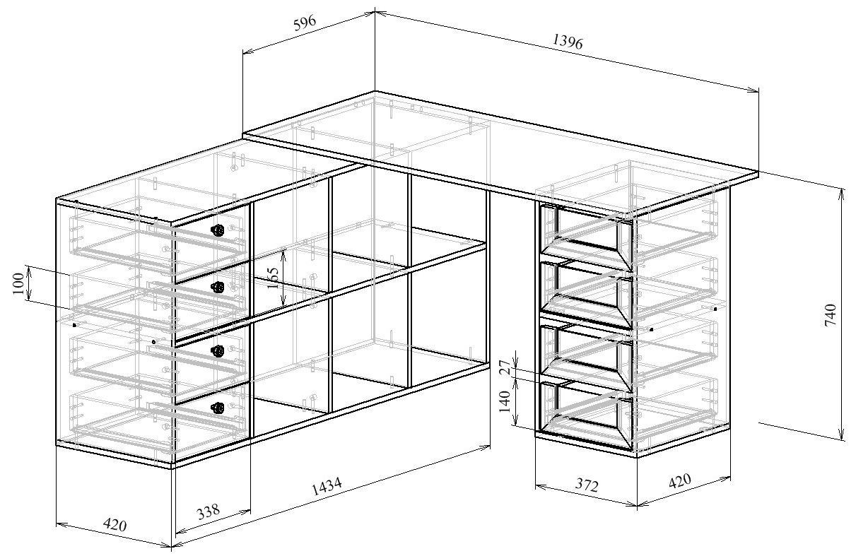 Стол является комплектом модульной системы Прайм. Вы можете собрать индивидуальный комплект из столешниц разных размеров, тумб разных форм и их наполнений (дверок, блока ящиков, ящиков со стеклом или больших ящиков).