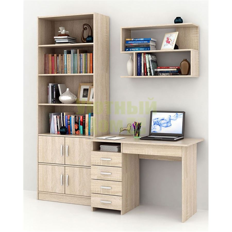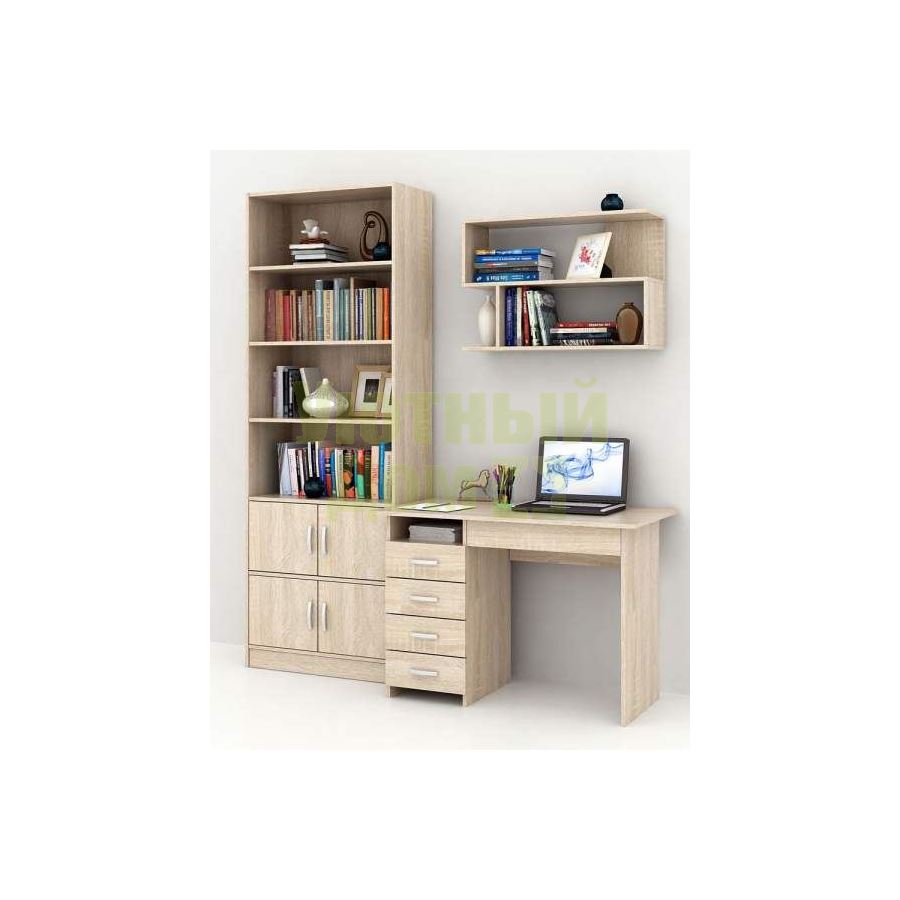 Каждый элемент возможно приобрести по отдельности. Состав комплекта: стол Милан-1 (1 шт.), полка Файн-13 (1 шт.), стеллаж Либерти-5 (1 шт.), дверка для стеллажей Либерти (1 шт.).